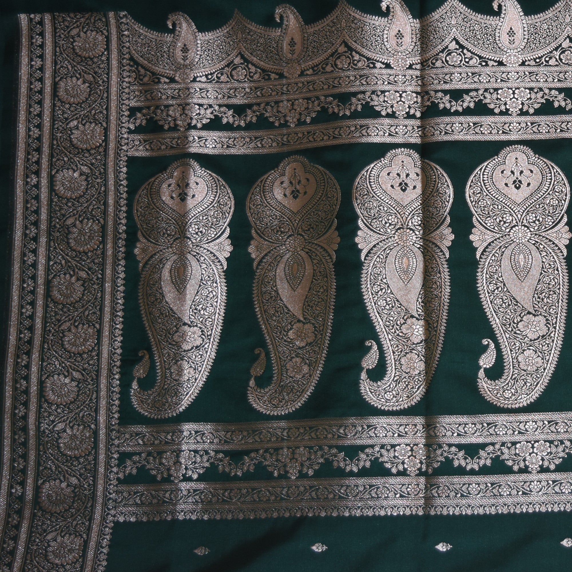 Grace your ethnic wardrobe with this elegant art silk benarasi saree in a rich bottle green shade. beautifully woven with a jari boarder, the saree showcases intricate motifs inspired by classic Indian craftsmanship. the smoth art silk fabric offers a luxurious sheen and comfortable drape, pair it with traditional jewelry to complete a timeless and regal look