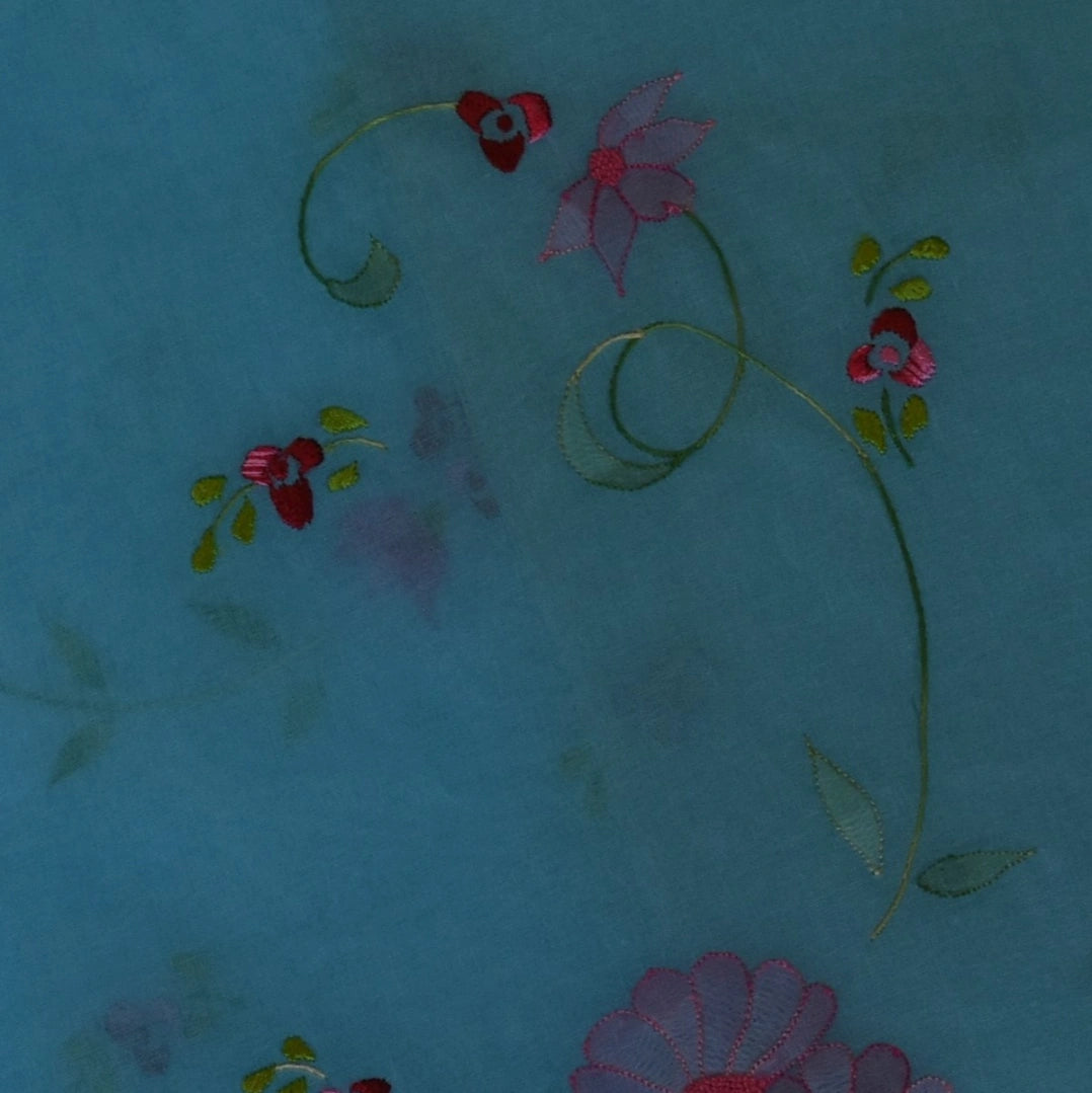 This organdy saree in a azure shade features elegant traditional patterns, perfect for graceful appearances and festive flair.