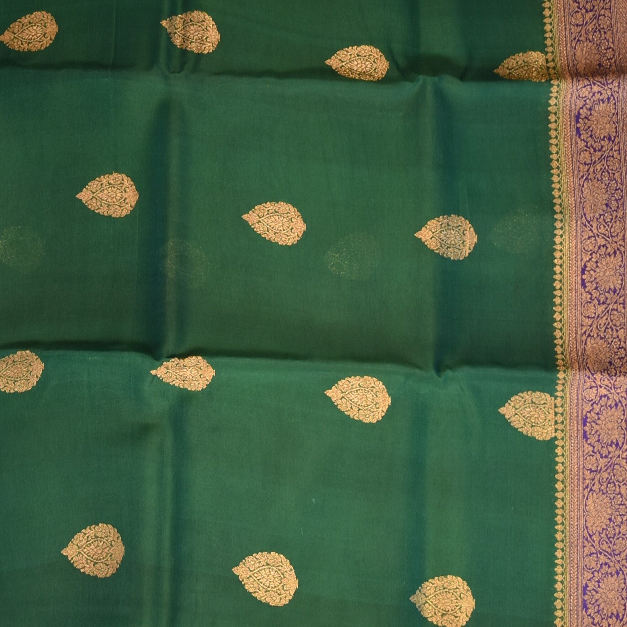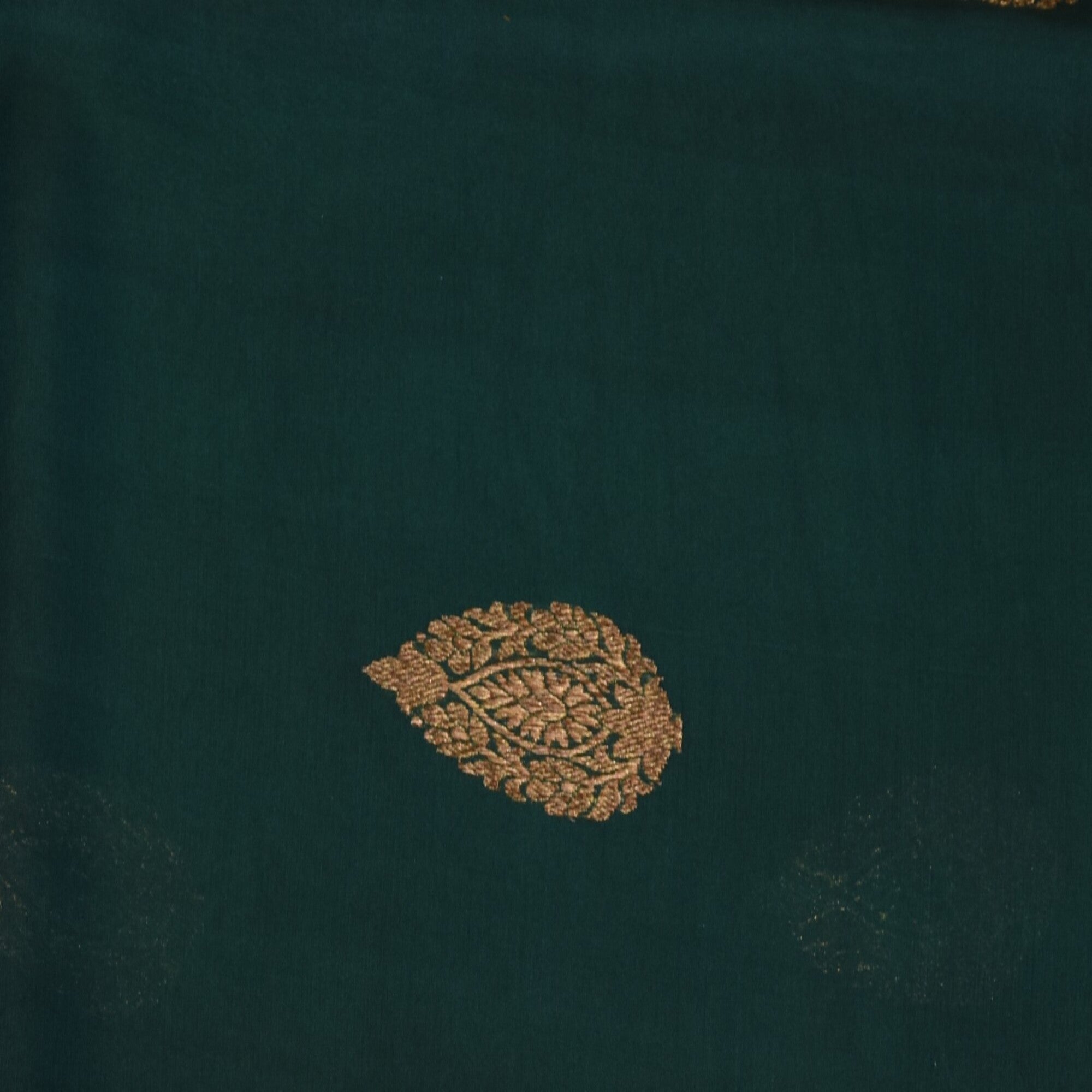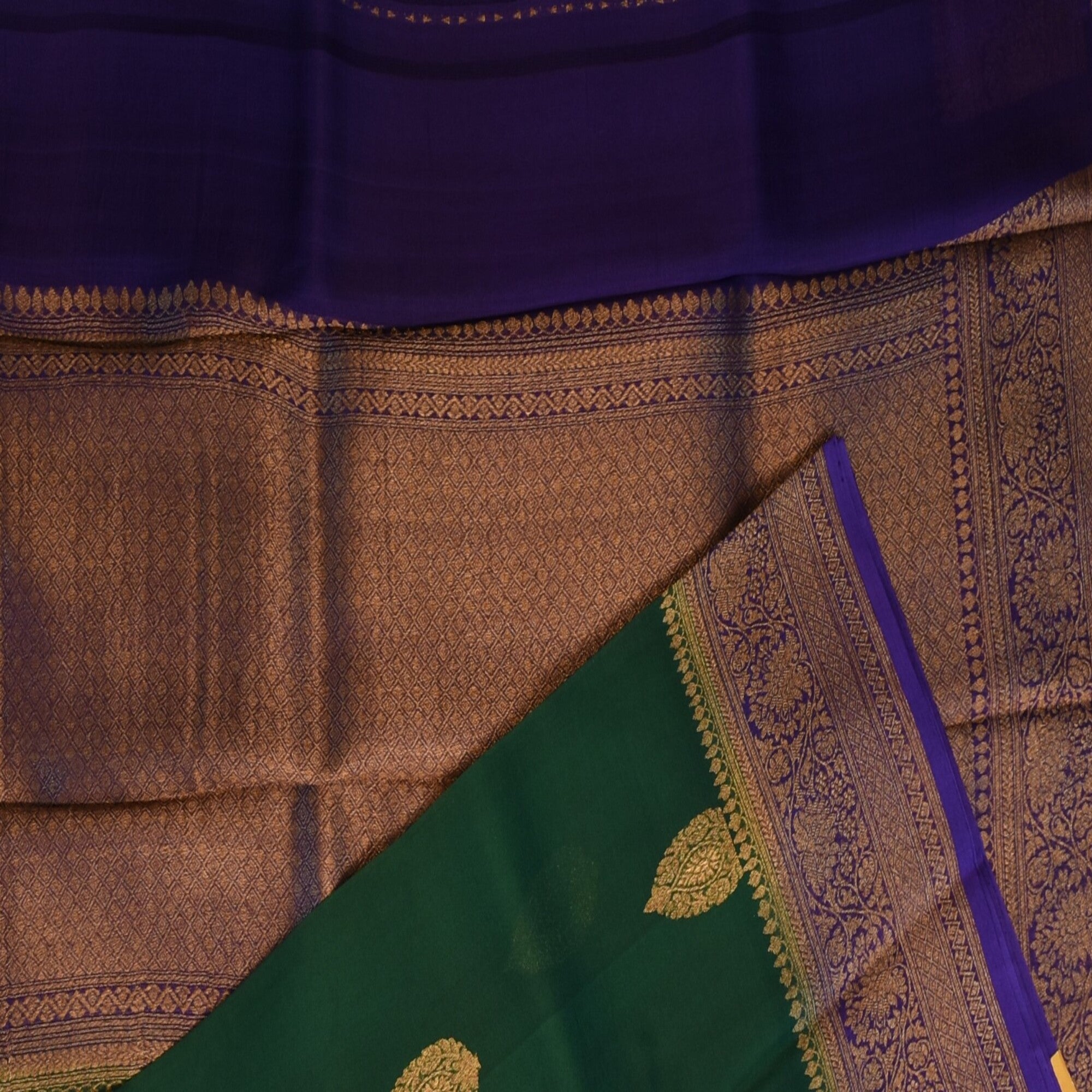 The cora benarasi silk bottle green saree with purple boarder jari work. Exquisite and timeless, this benarasi crepe silk saree is a perfect blend of traditional artistry and modern eligence, crafted from premium crepe silk, it drapes gracefully, offering a soft, fluid fall that flatters every silhouette. Pair it with a complementing silk blouse and traditional jewellery to complete your royal ethnic look.