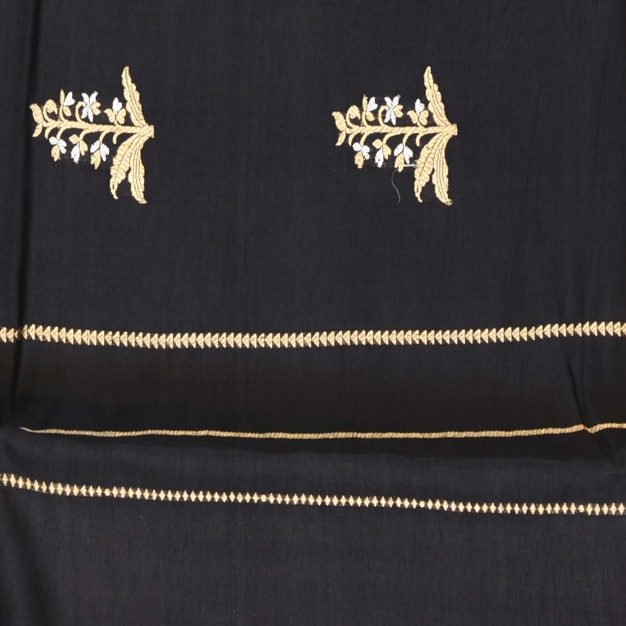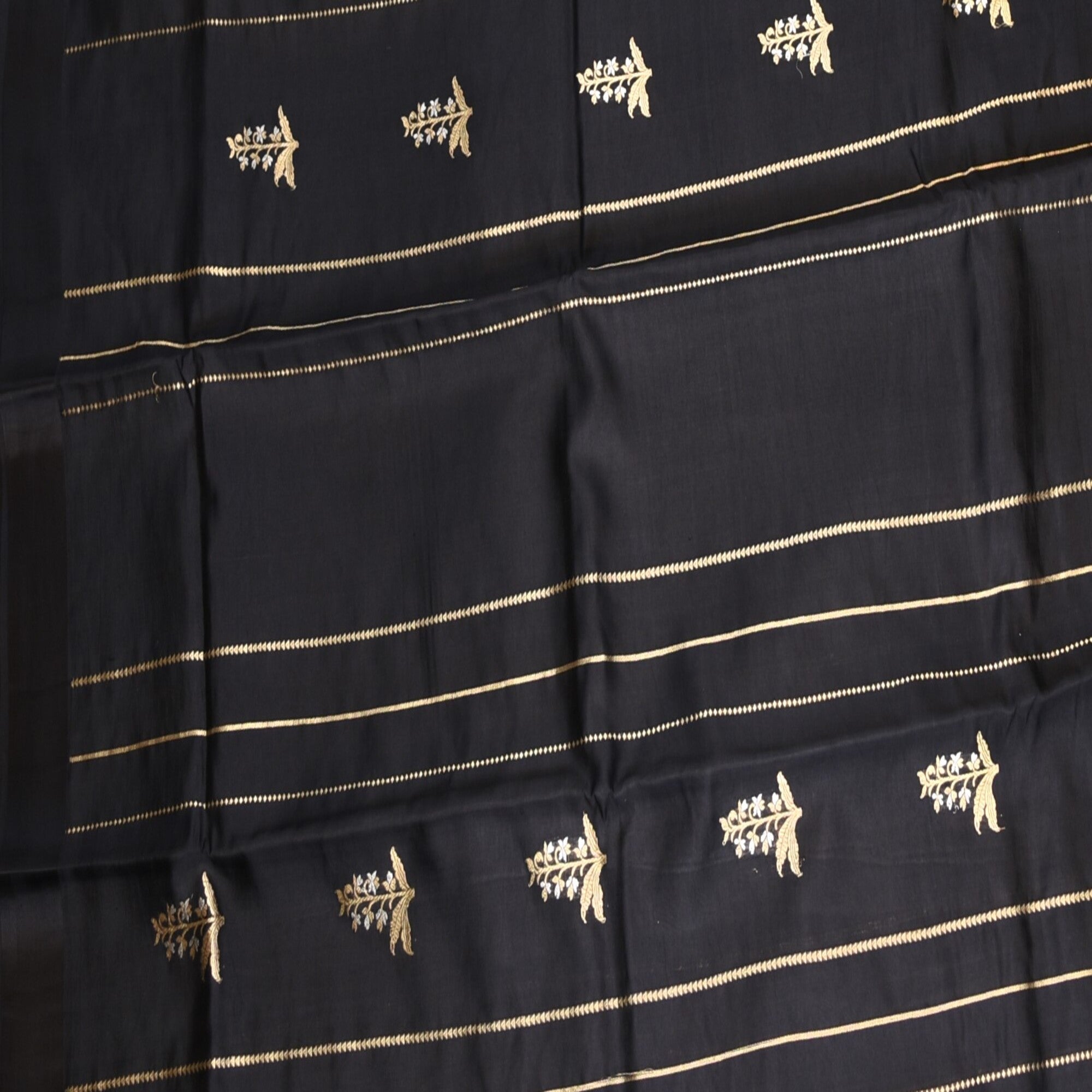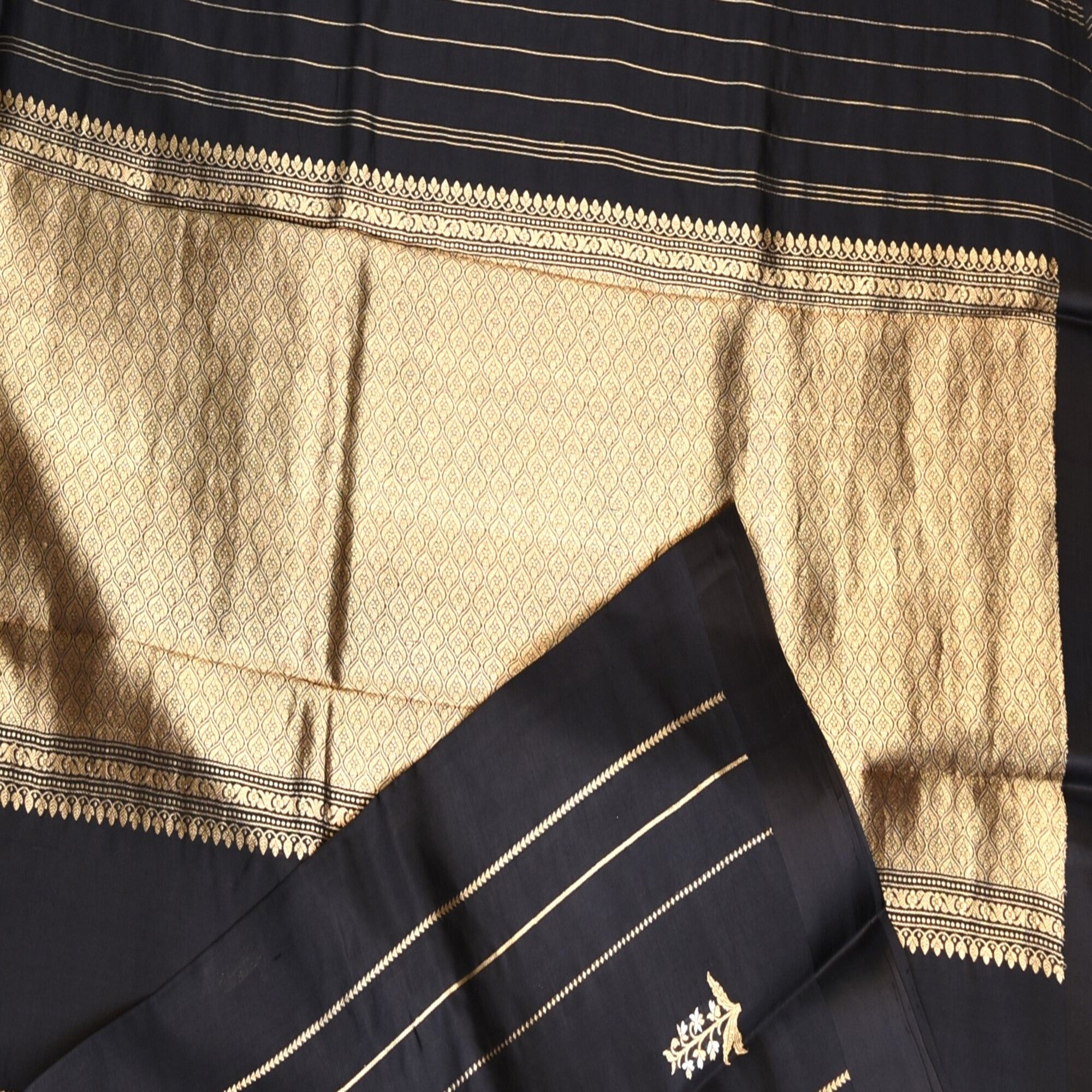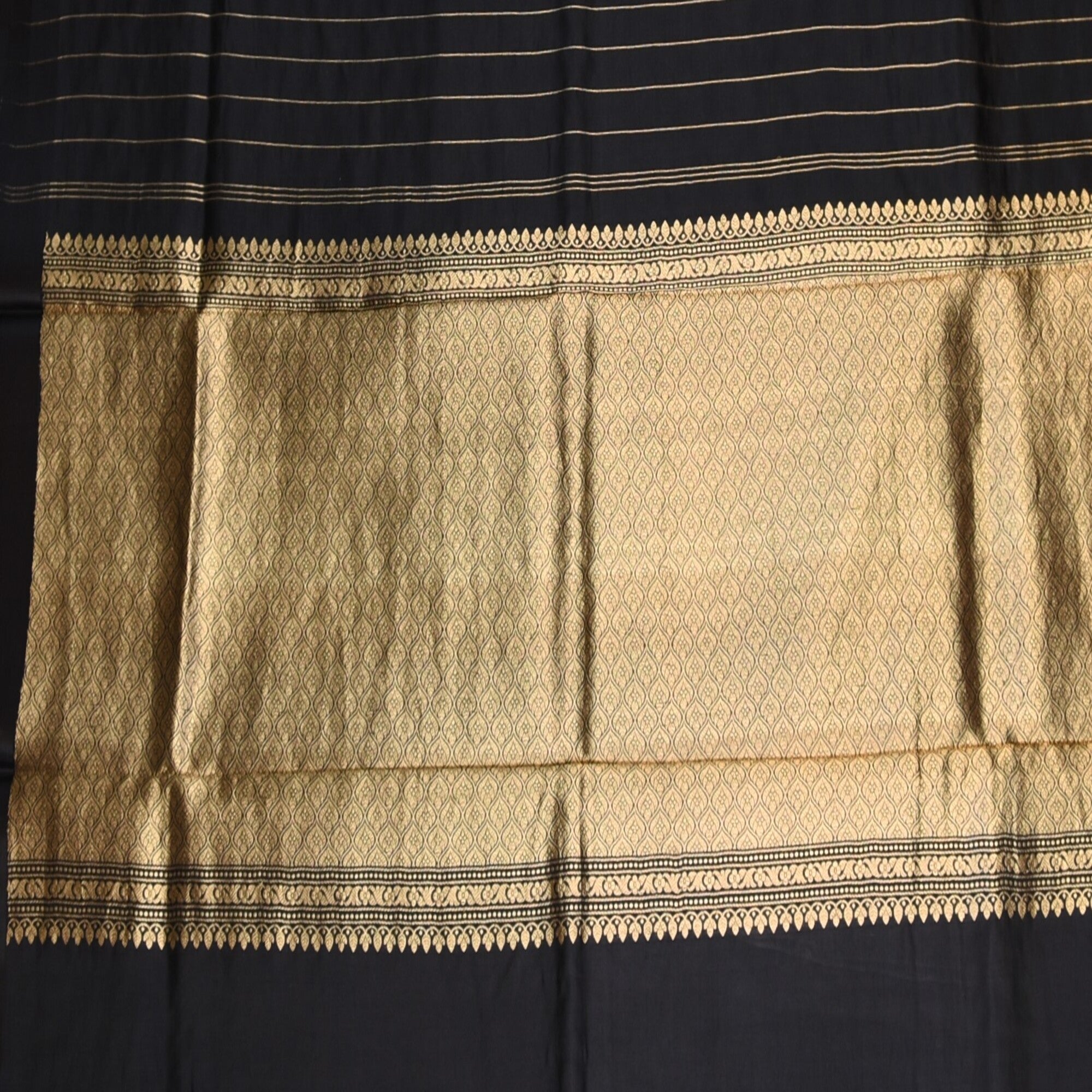 The kathan silk black saree with jari work. Exquisite and timeless, this benarasi crepe silk saree is a perfect blend of traditional artistry and modern eligence, crafted from premium crepe silk, it drapes gracefully, offering a soft, fluid fall that flatters every silhouette. Pair it with a complementing silk blouse and traditonal jewellery to complete your royal ethnic look.