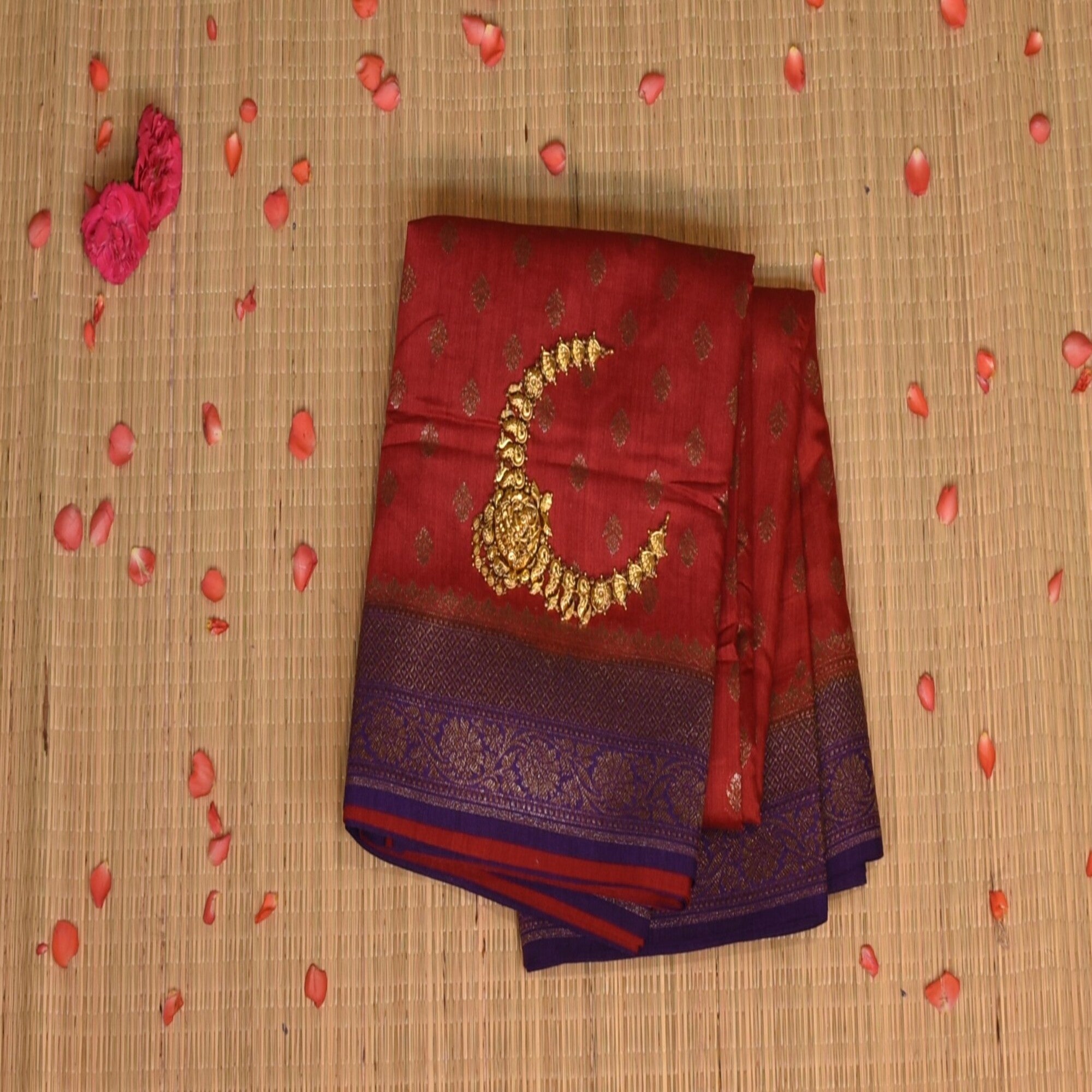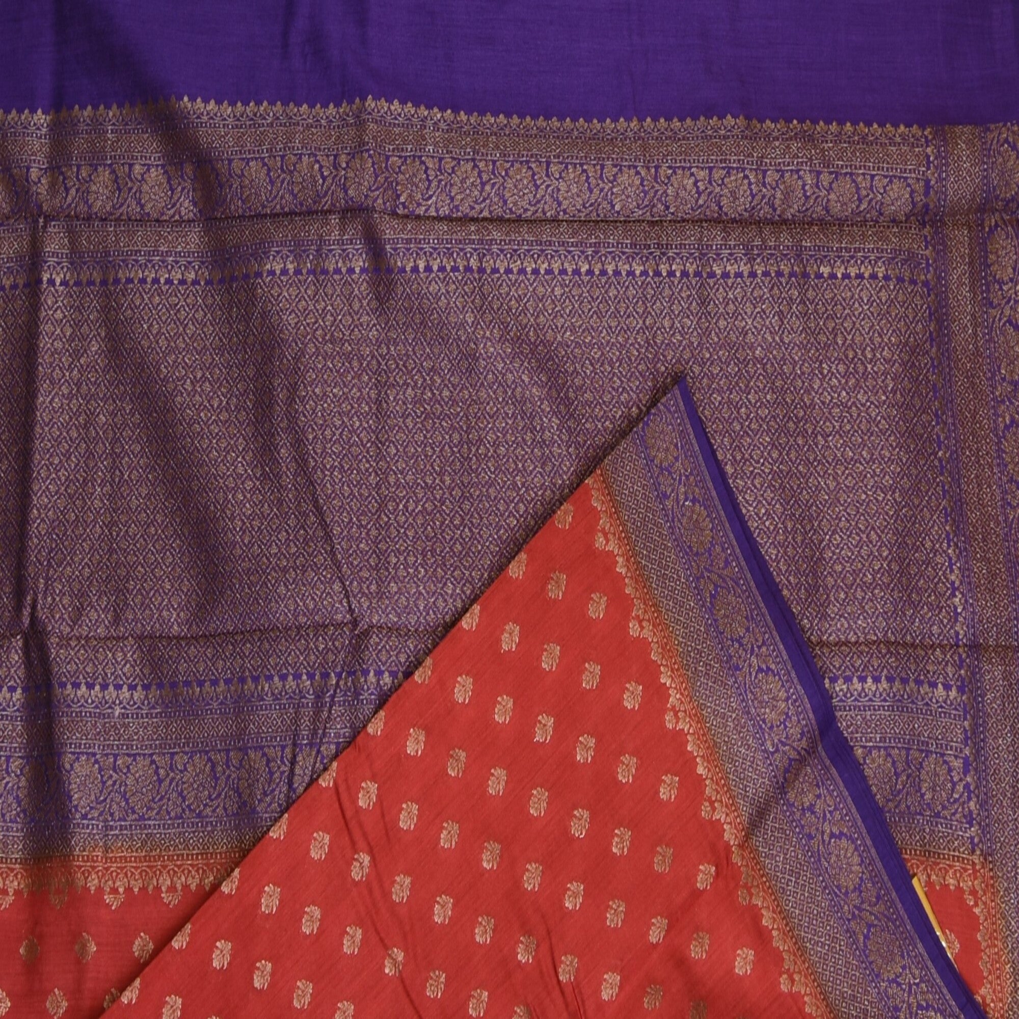 The linen brick red saree with violet jari boarder. Exquisite and timeless, this benarasi crepe silk saree is a perfect blend of traditional artistry and modern eligence, crafted from premium crepe silk, it drapes gracefully, offering a soft, fluid fall that flatters every silhouette. Pair it with a complementing silk blouse and traditional jewellery to complete your royal ethnic look.
