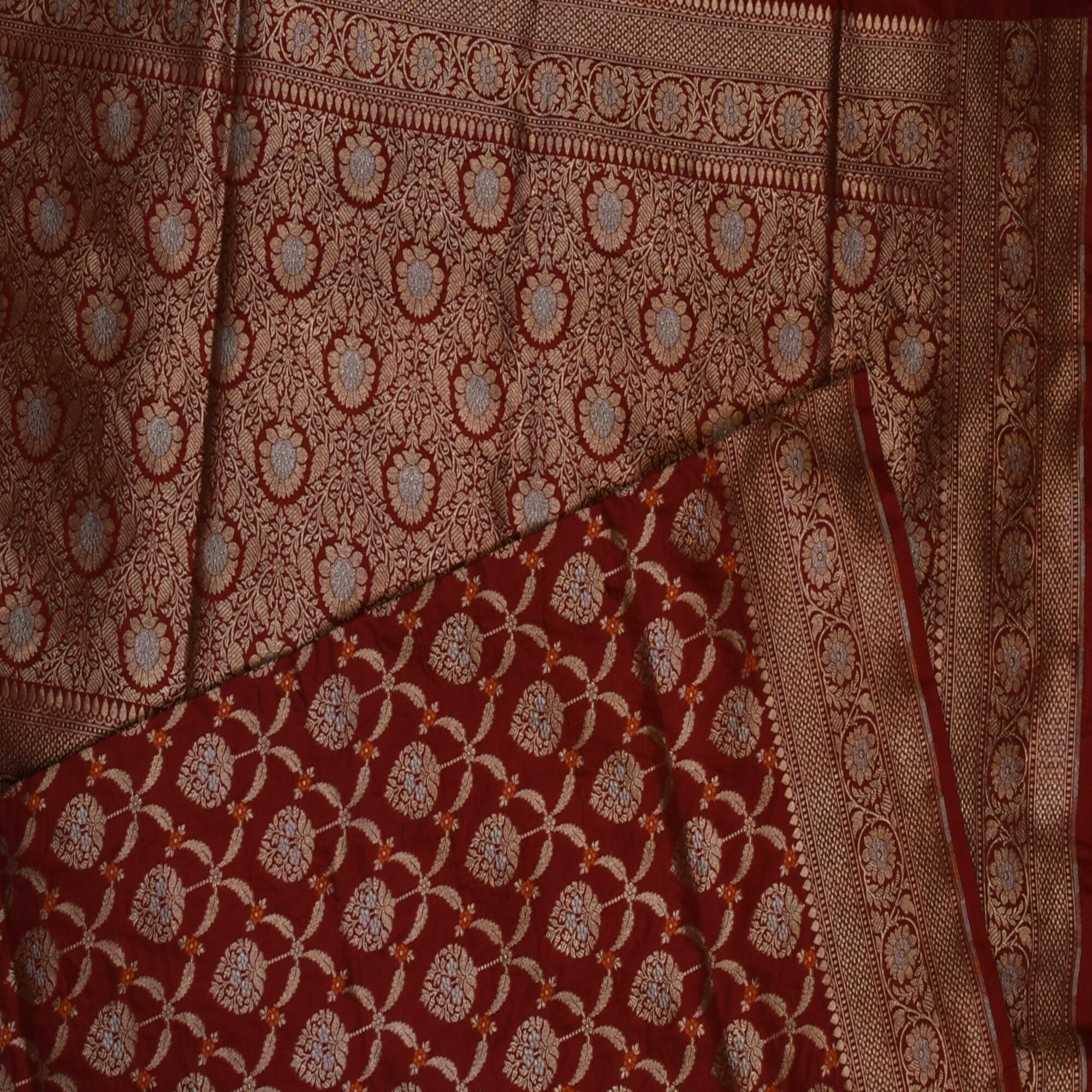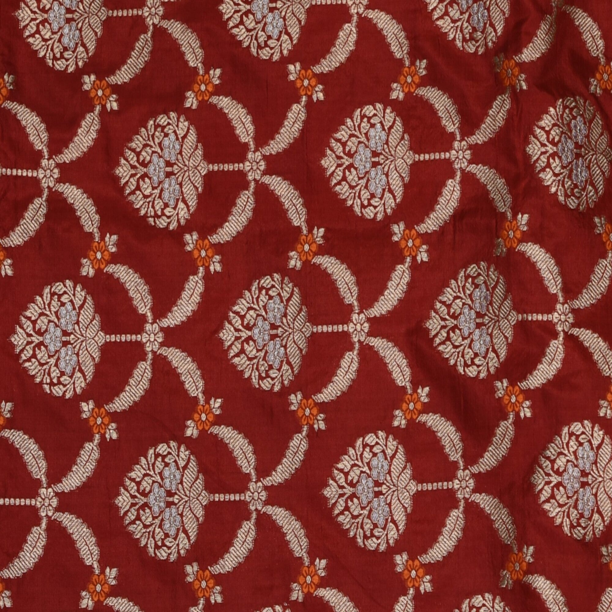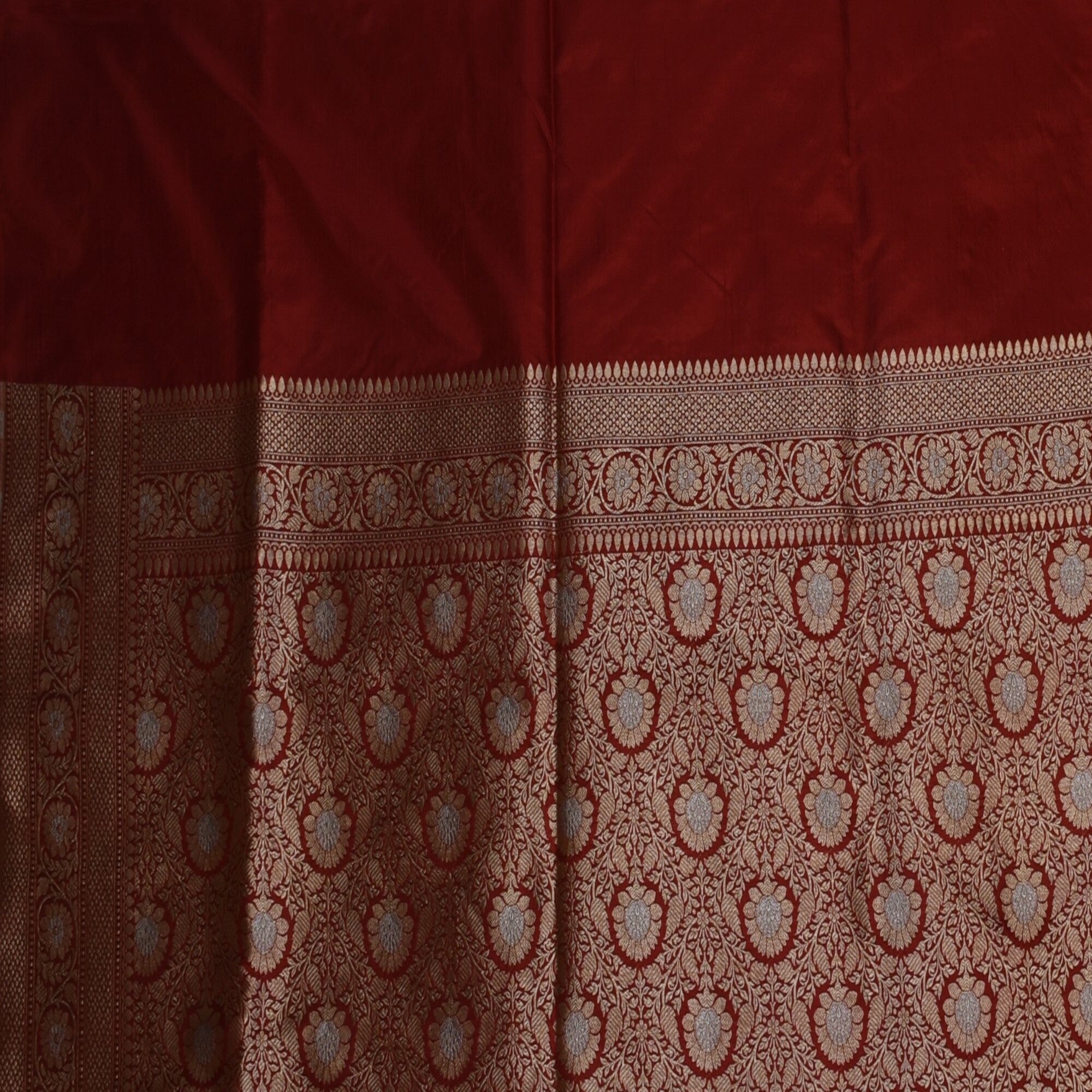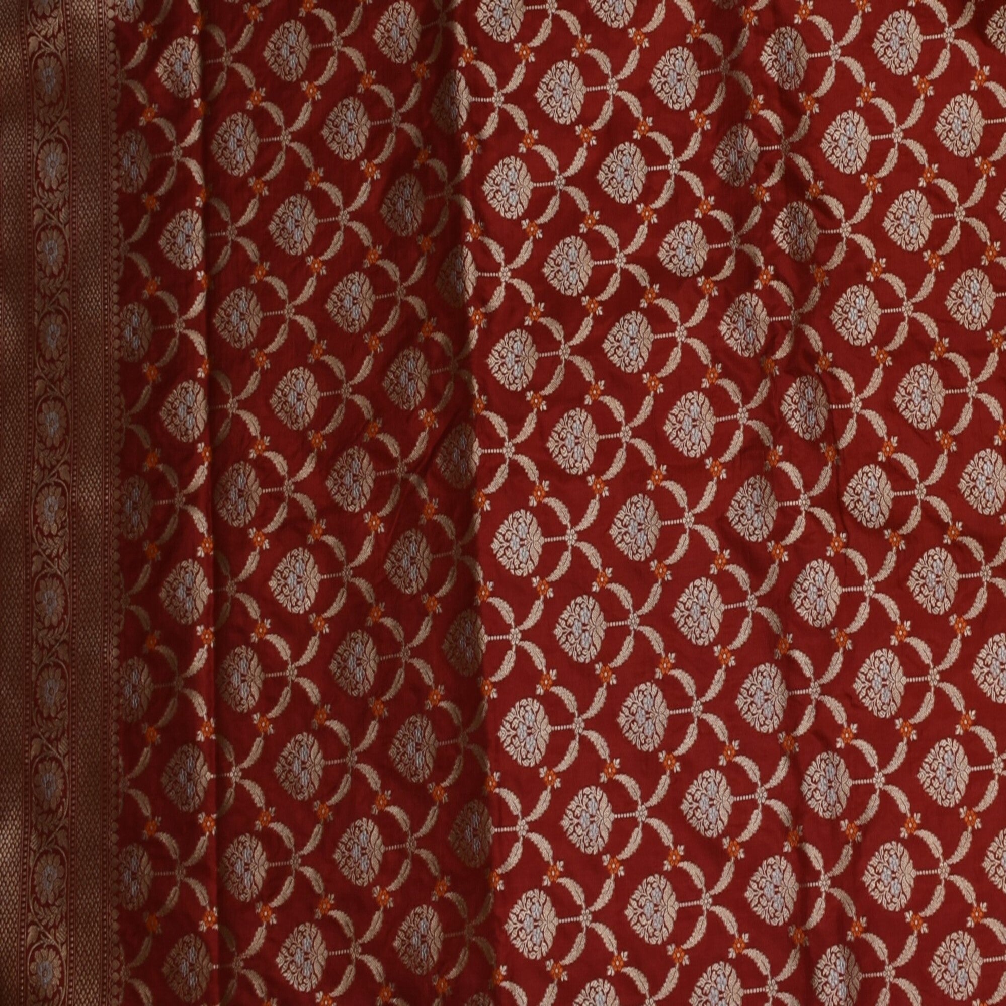 The pure silk brick red saree with jari work. Exquisite and timeless, this benarasi crepe silk saree is a perfect blend of traditional artistry and modern eligence, crafted from premium crepe silk, it drapes gracefully, offering a soft, fluid fall that flatters every silhouette. Pair it with a complementing silk blouse and traditional jewellery to complete your royal ethnic look.