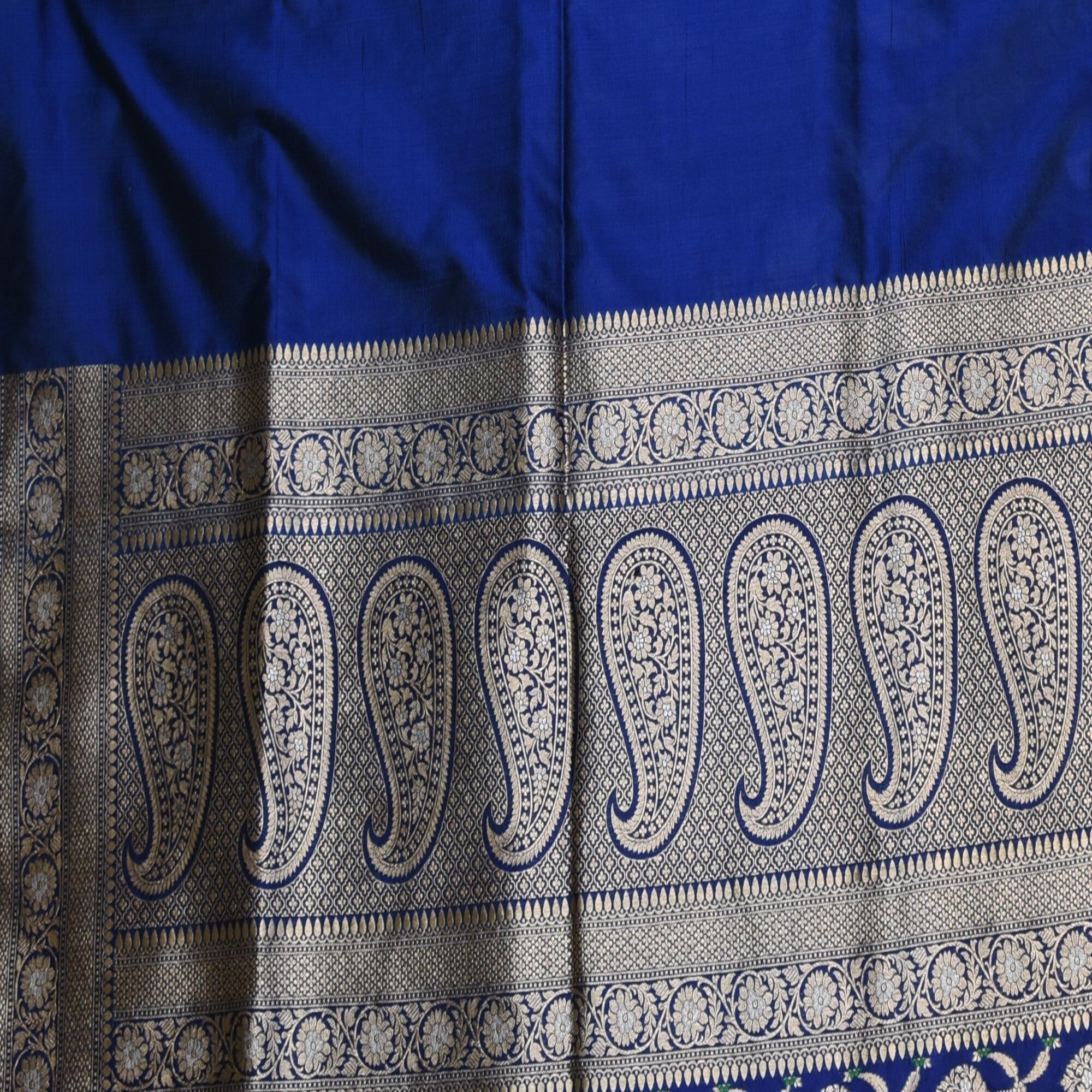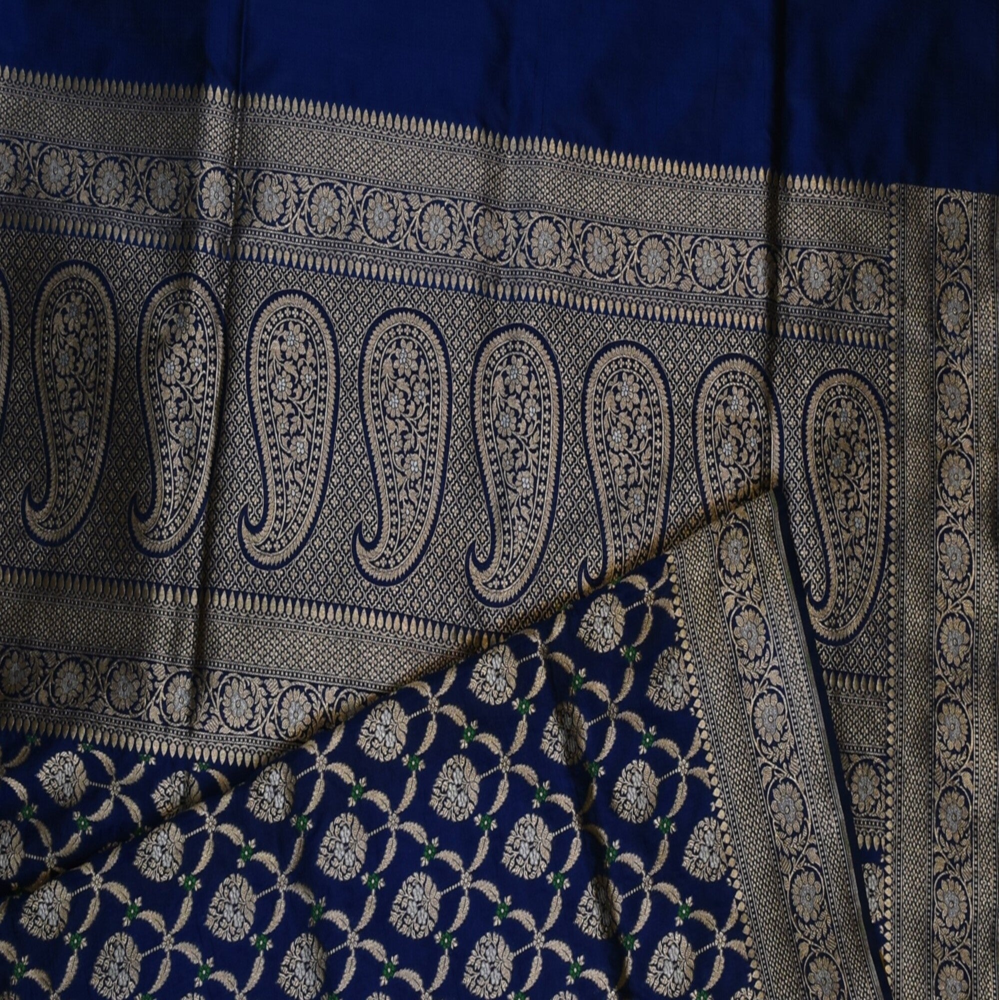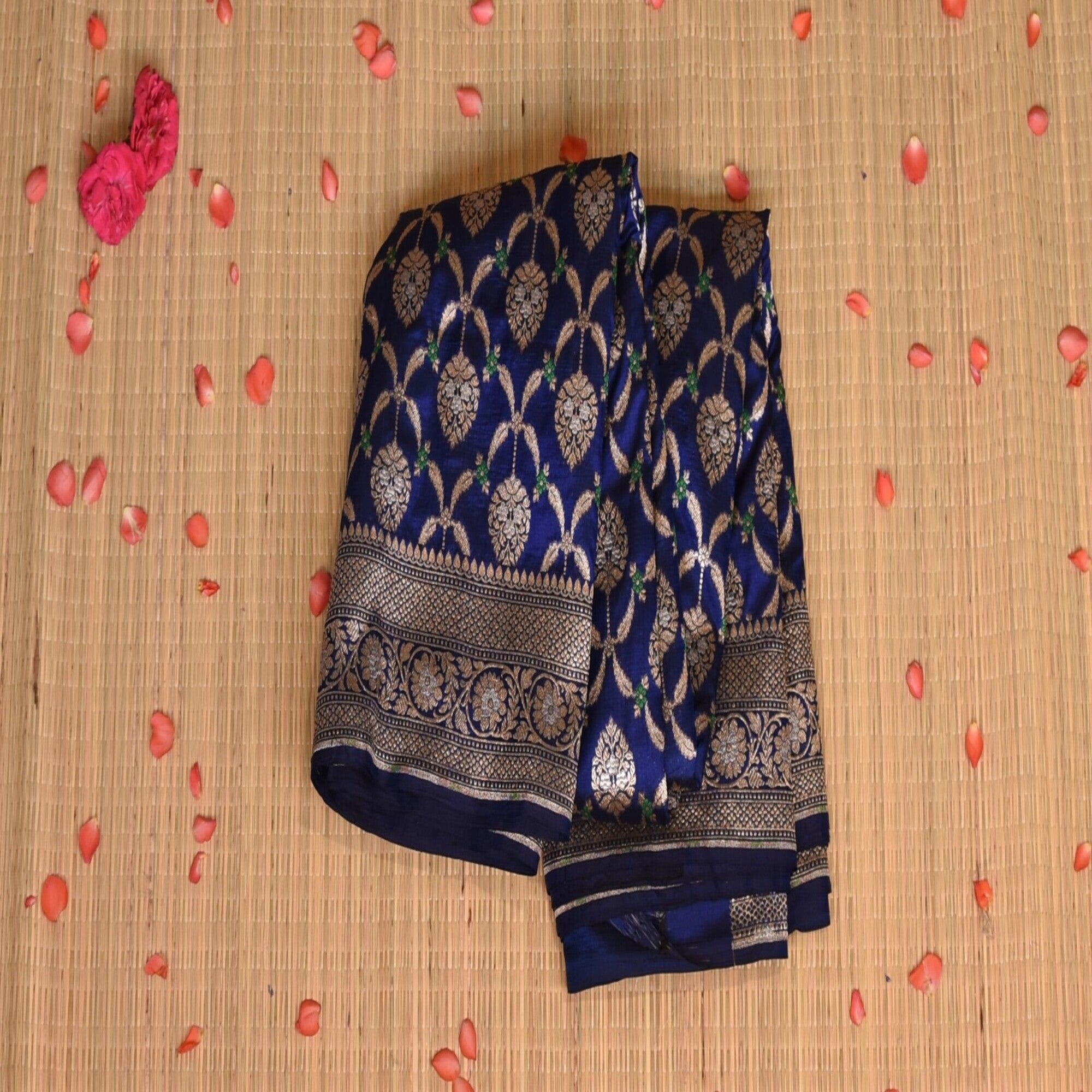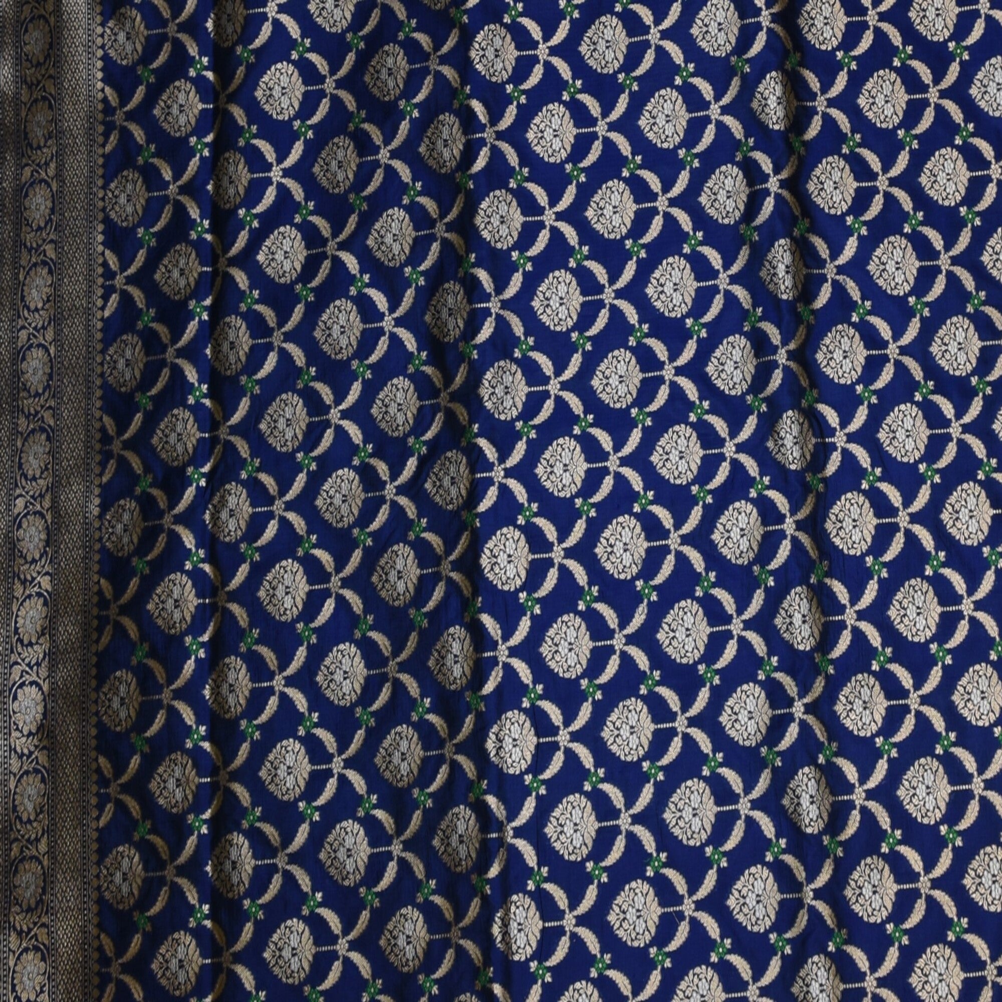 The pure silk navy blue saree with jari work. Exquisite and timeless, this benarasi crepe silk saree is a perfect blend of traditional artistry and modern eligence, crafted from premium crepe silk, it drapes gracefully, offering a soft, fluid fall that flatters every silhouette. Pair it with a complementing silk blouse and traditional jewellery to complete your royal ethnic look.