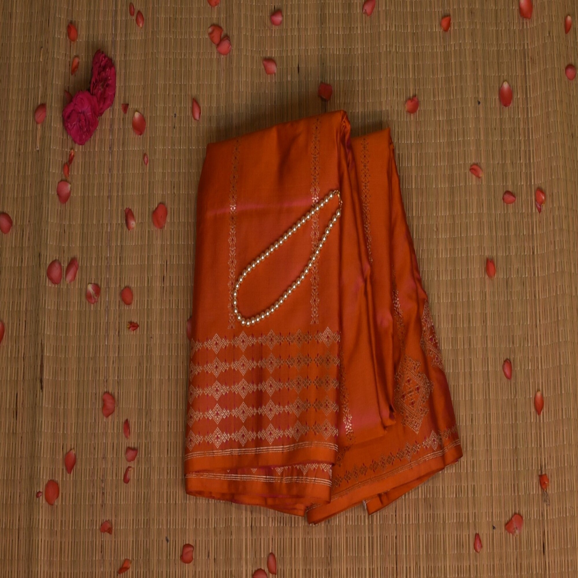 The pure silk orange & pink saree with jari work. Exquisite and timeless, this benarasi crepe silk saree is a perfect blend of traditional artistry and modern eligence, crafted from premium crepe silk, it drapes gracefully, offering a soft, fluid fall that flatters every silhouette. Pair it with a complementing silk blouse and traditional jewellery to complete your royal ethnic look.
