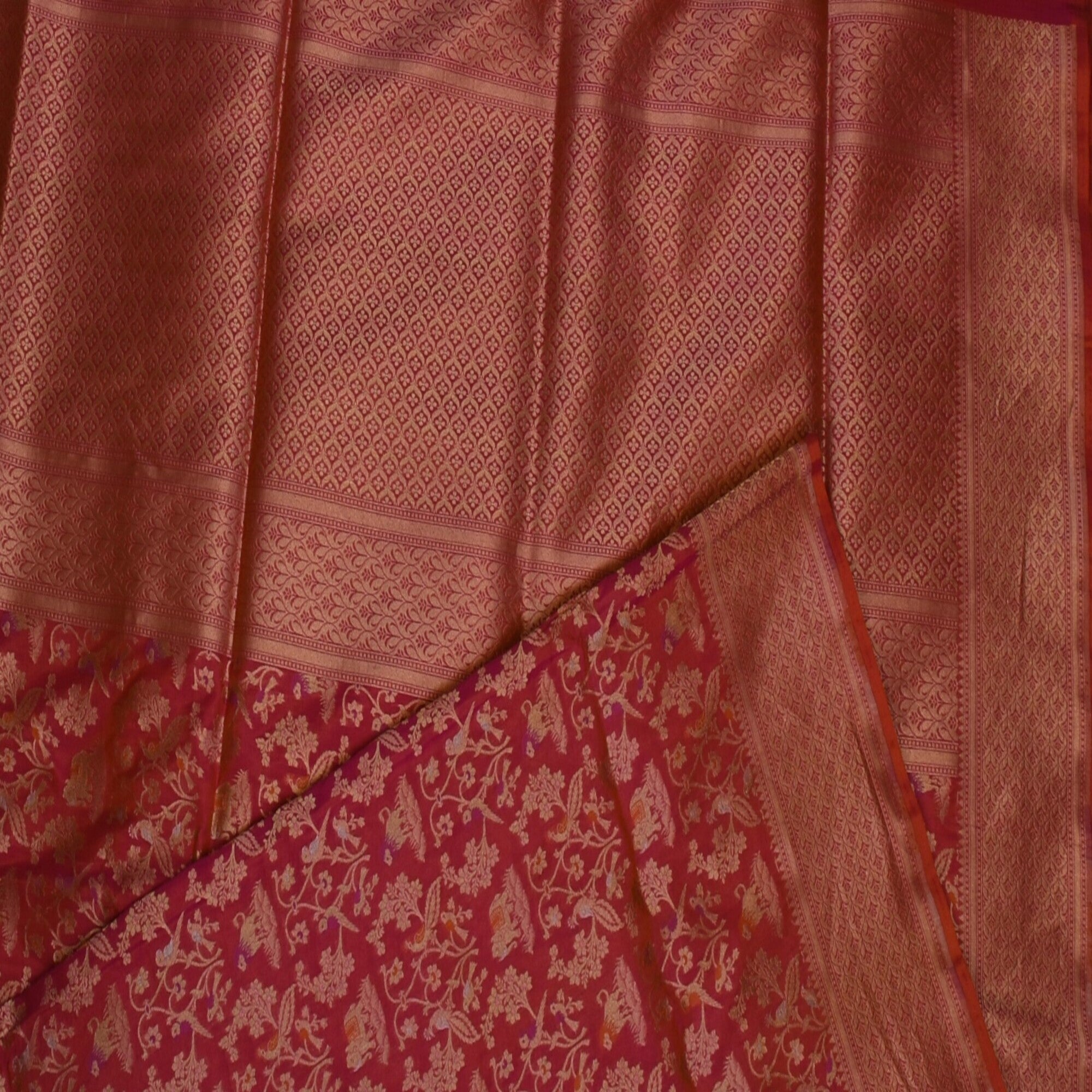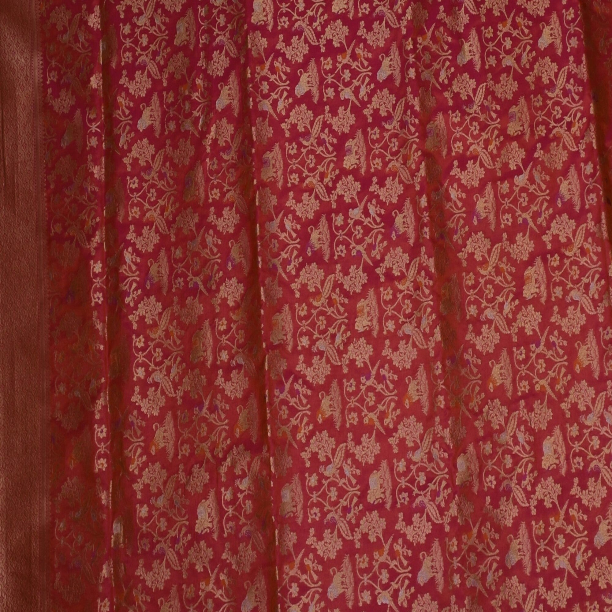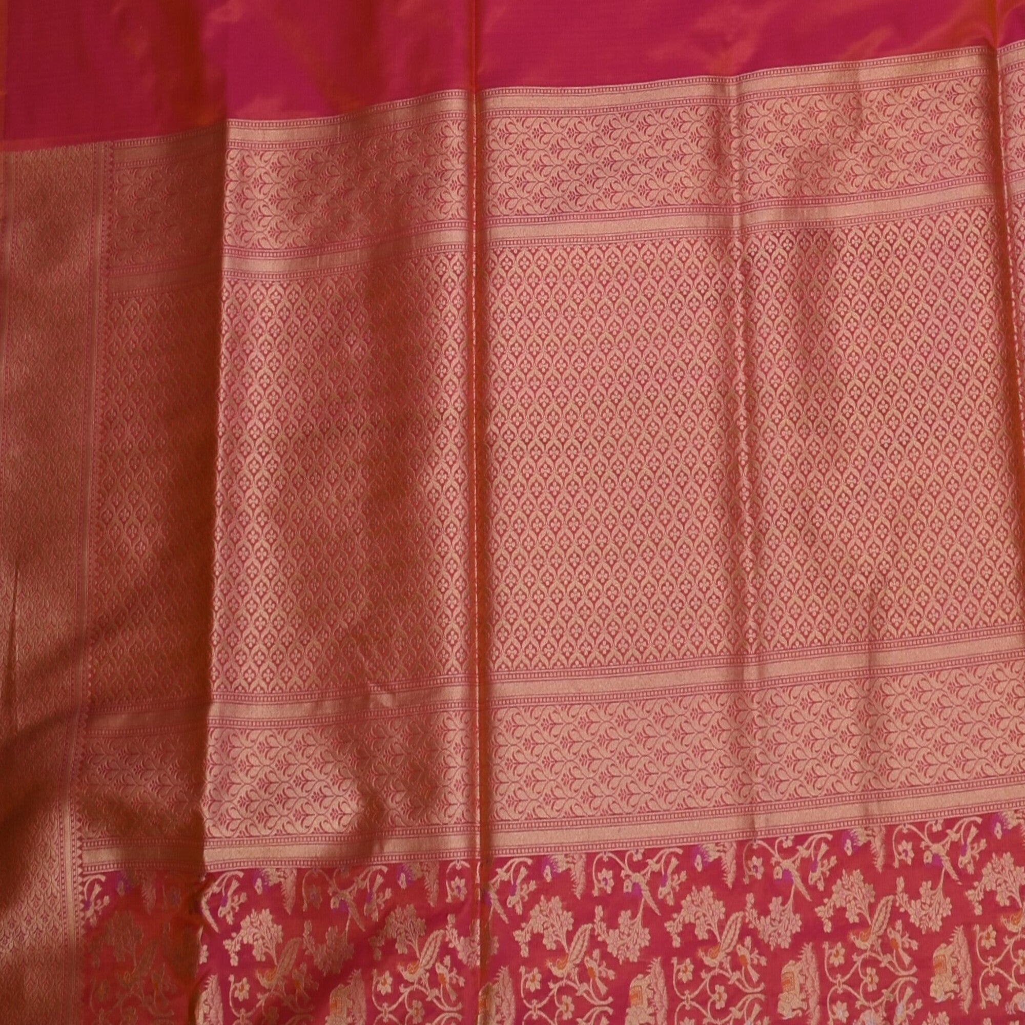 The pure silk pink & orange saree with jari work. Exquisite and timeless, this benarasi crepe silk saree is a perfect blend of traditional artistry and modern eligence, crafted from premium crepe silk, it drapes gracefully, offering a soft, fluid fall that flatters every silhouette. Pair it with a complementing silk blouse and traditional jewellery to complete your royal ethnic look.