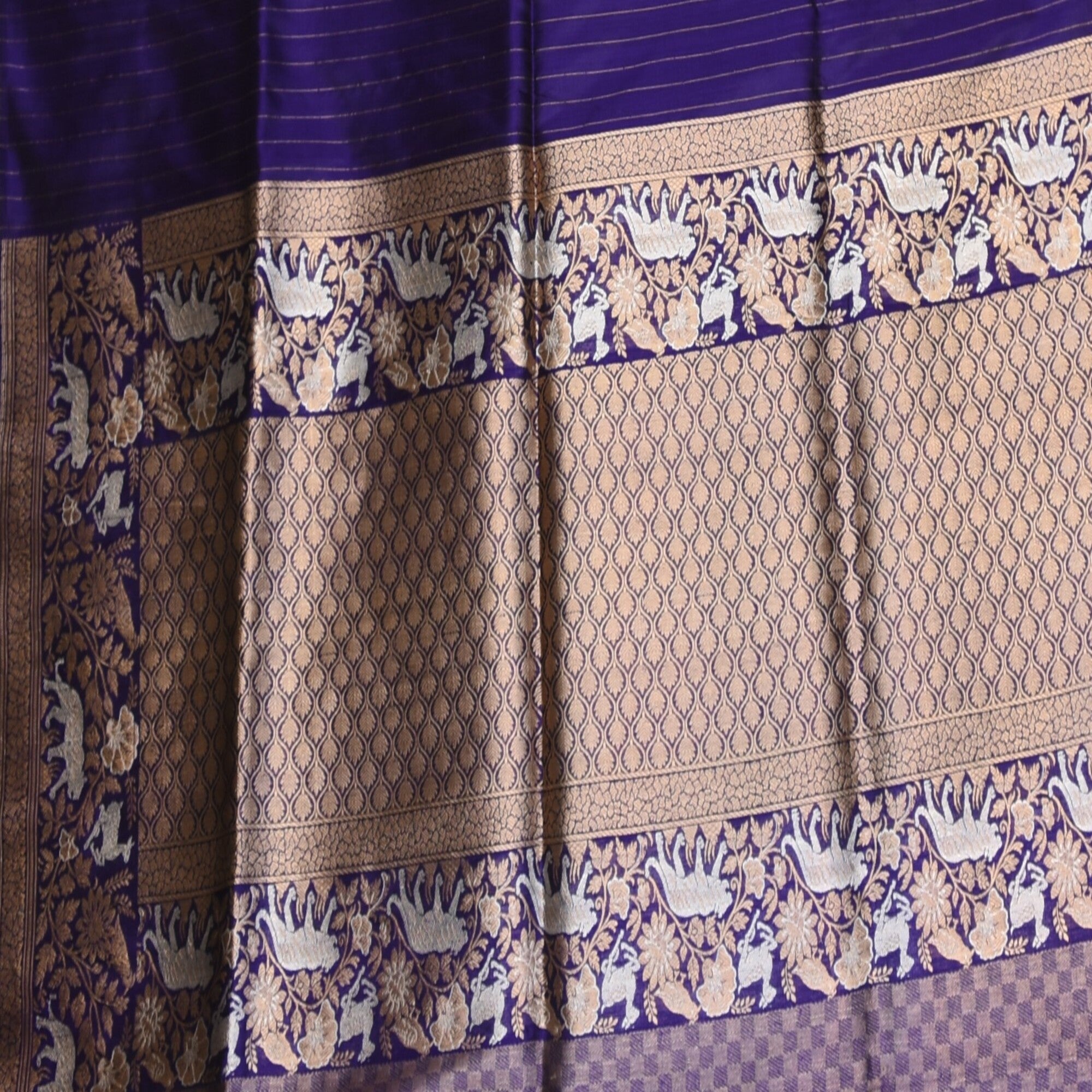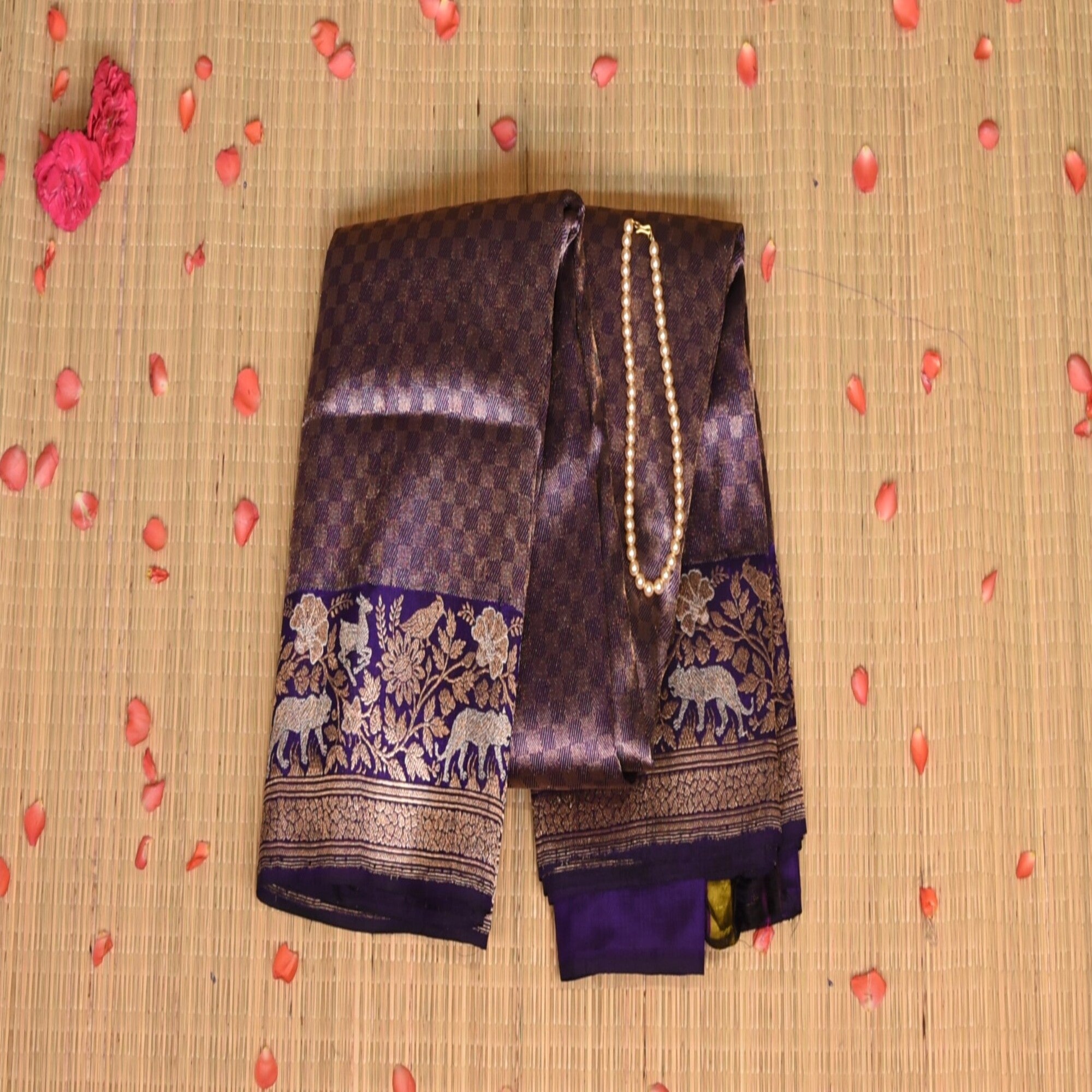 The pure silk violet saree with jari work. Exquisite and timeless, this benarasi crepe silk saree is a perfect blend of traditional artistry and modern eligence, crafted from premium crepe silk, it drapes gracefully, offering a soft,  fluid fall that flatters every silhouette. Pair it with a complementing silk blouse and traditional jewellery to complete your royal ethnic look.