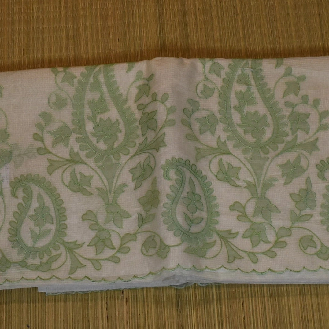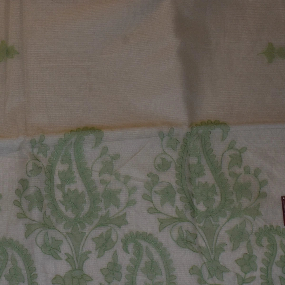 This cotton saree in a Cream with olive leaf flower design shade features elegant traditional patterns, perfect for graceful appearances and festive flair.