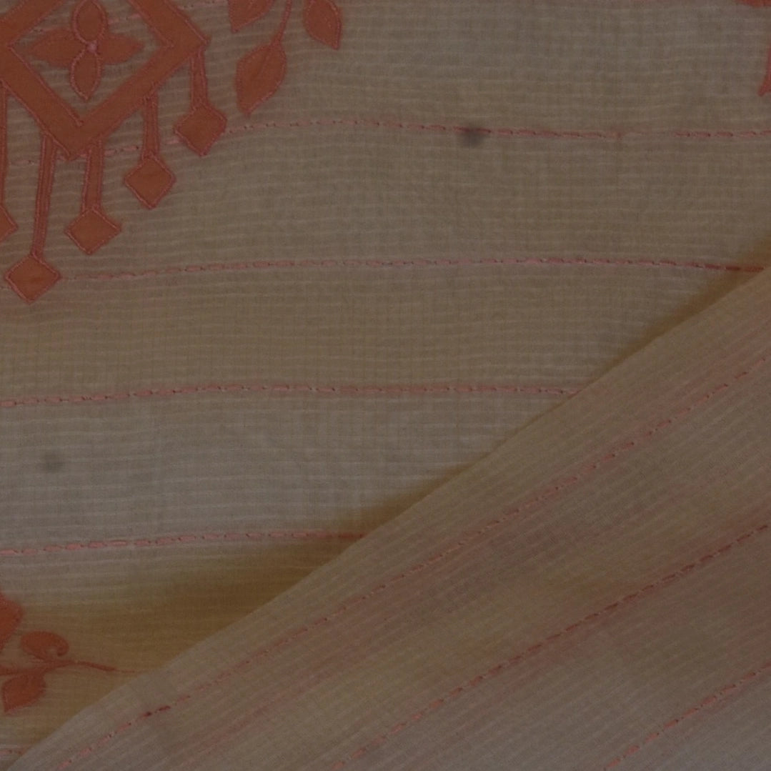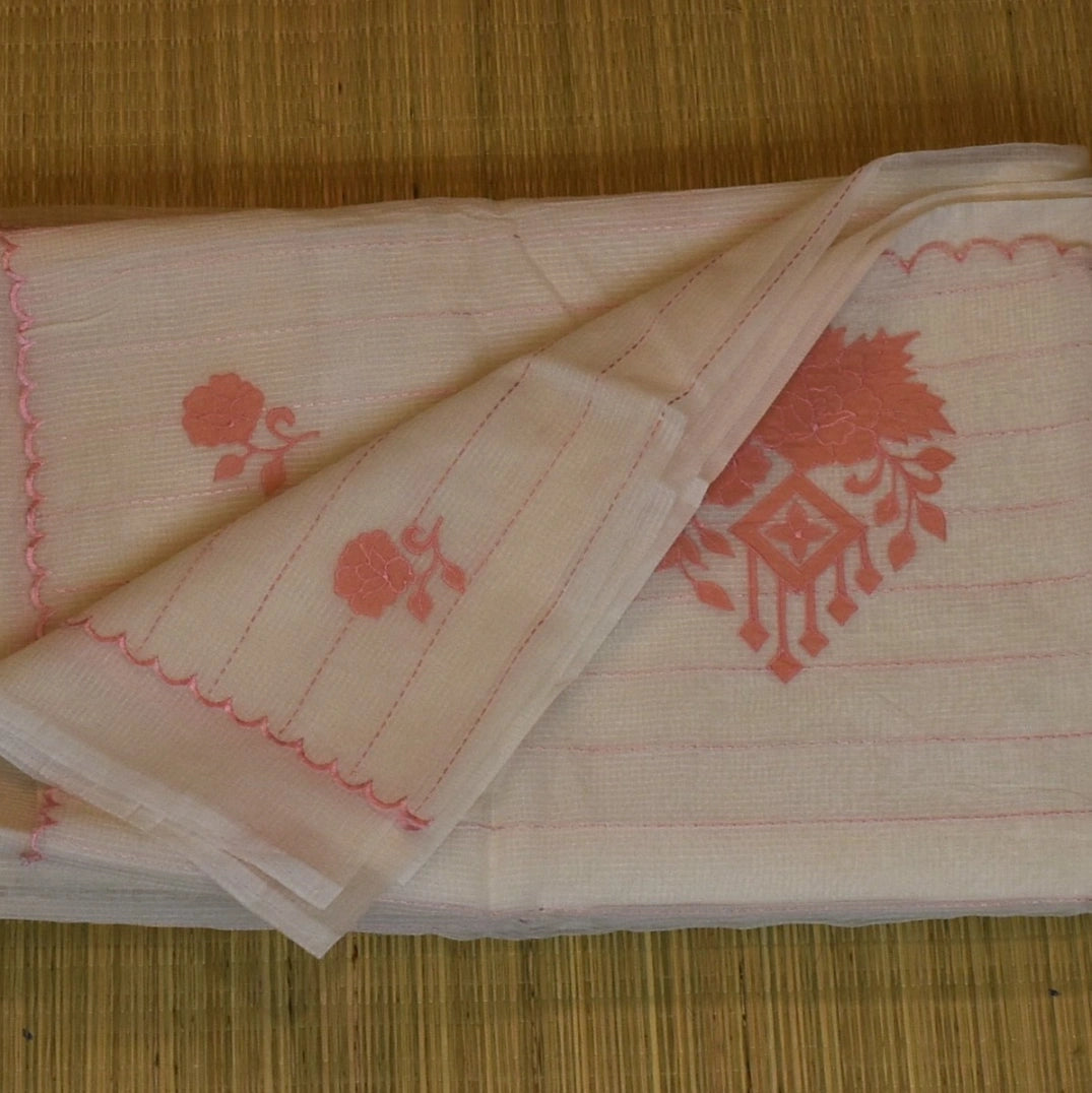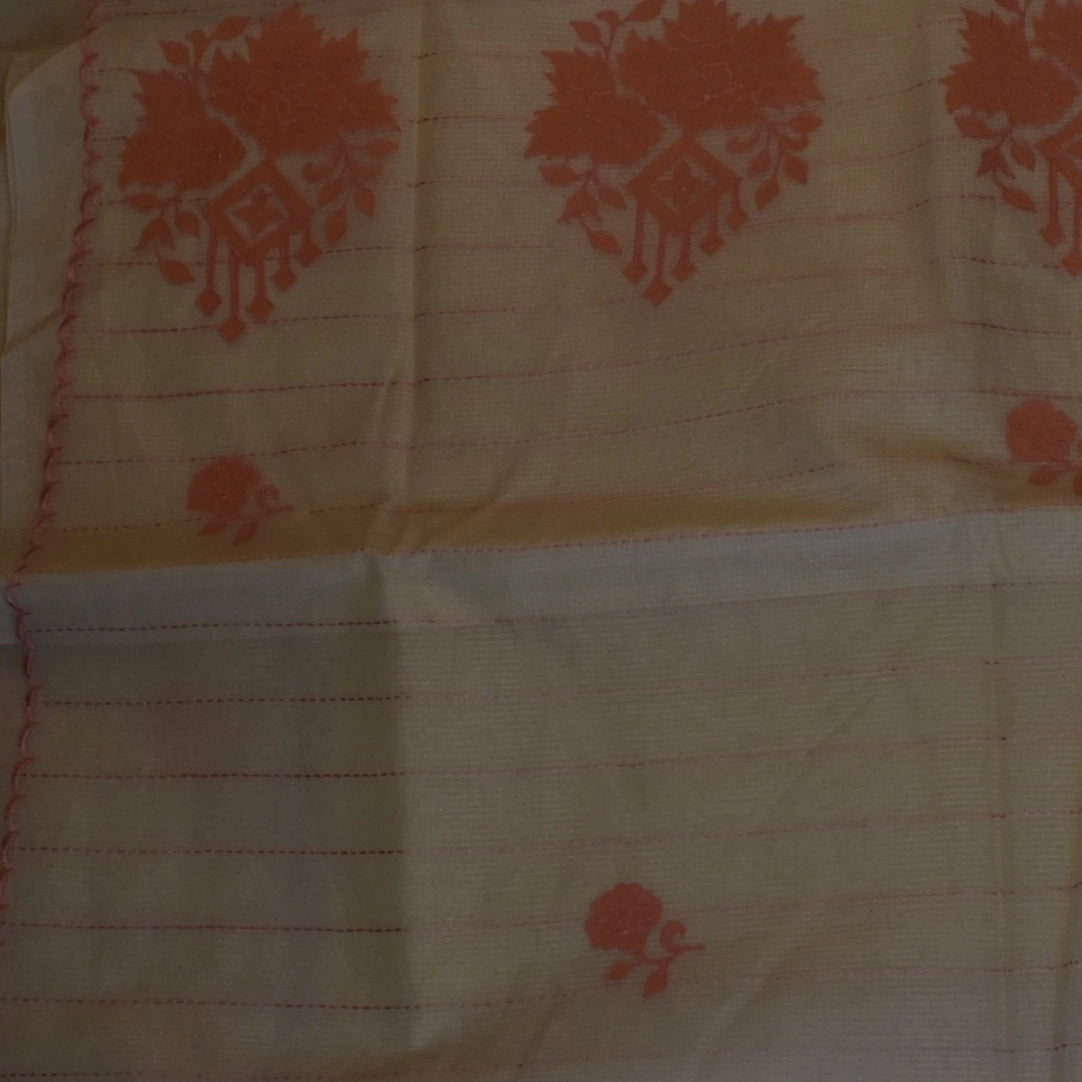This cotton saree in a Cream with terracotta flower design shade features elegant traditional patterns, perfect for graceful appearances and festive flair.
