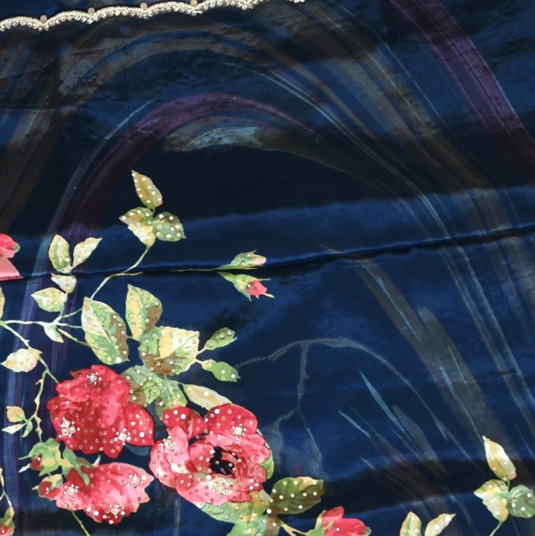 This crepe navy blue saree with blouse is a stunning piece with elegant details that elevate your traditional look. Perfect for celebrations, weddings, or festive wear.