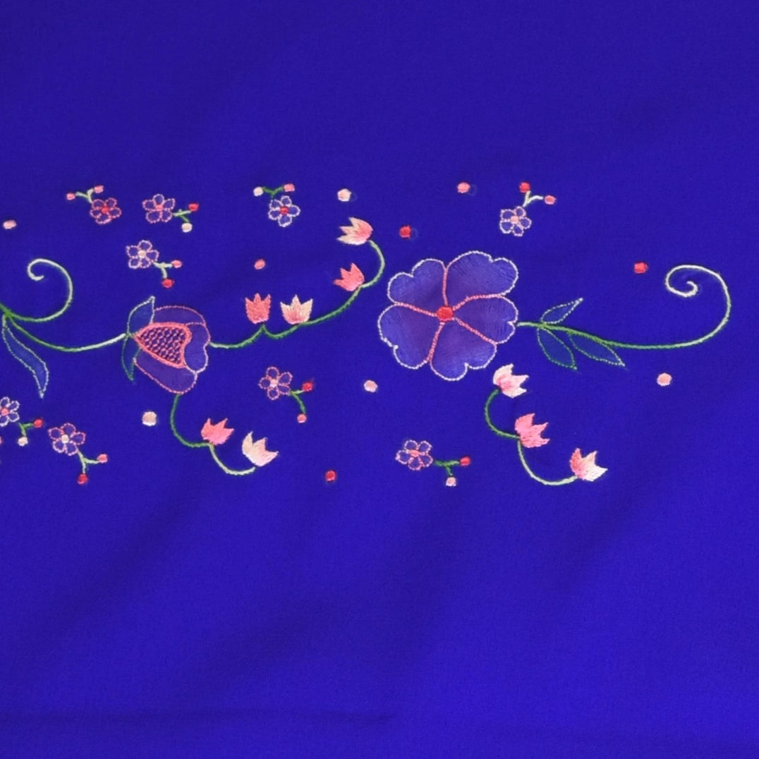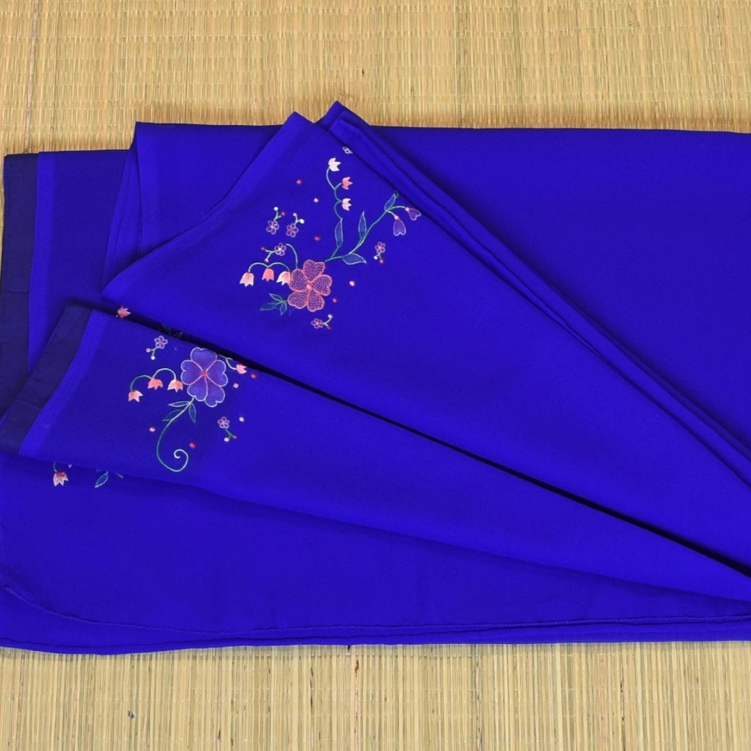 This chiffon saree in a electric blue shade features elegant traditional patterns, perfect for graceful appearances and festive flair.