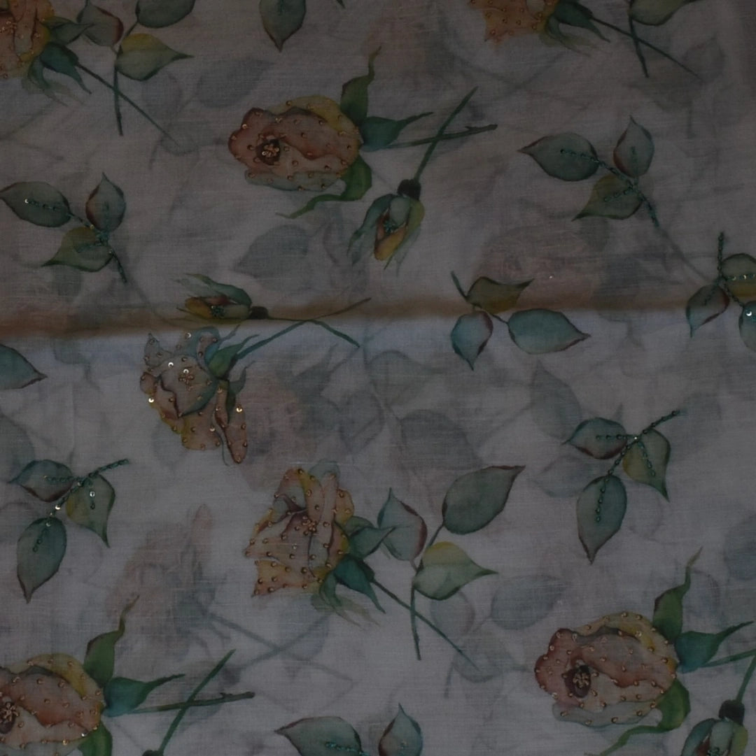 This cotton saree in a White with pine green flower design shade features elegant traditional patterns, perfect for graceful appearances and festive flair.