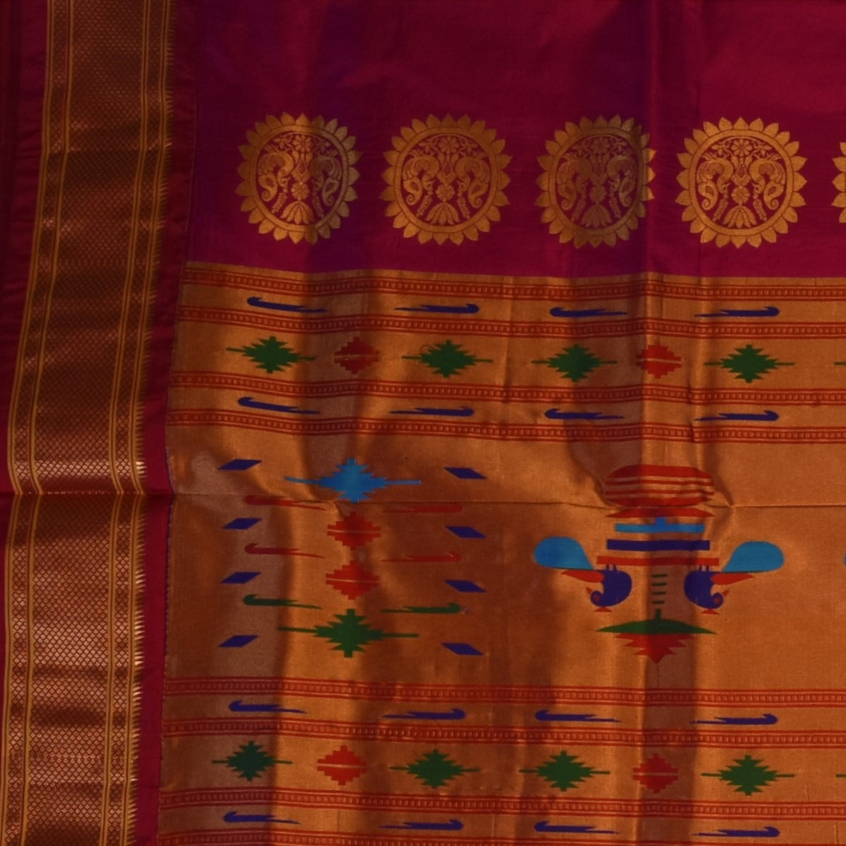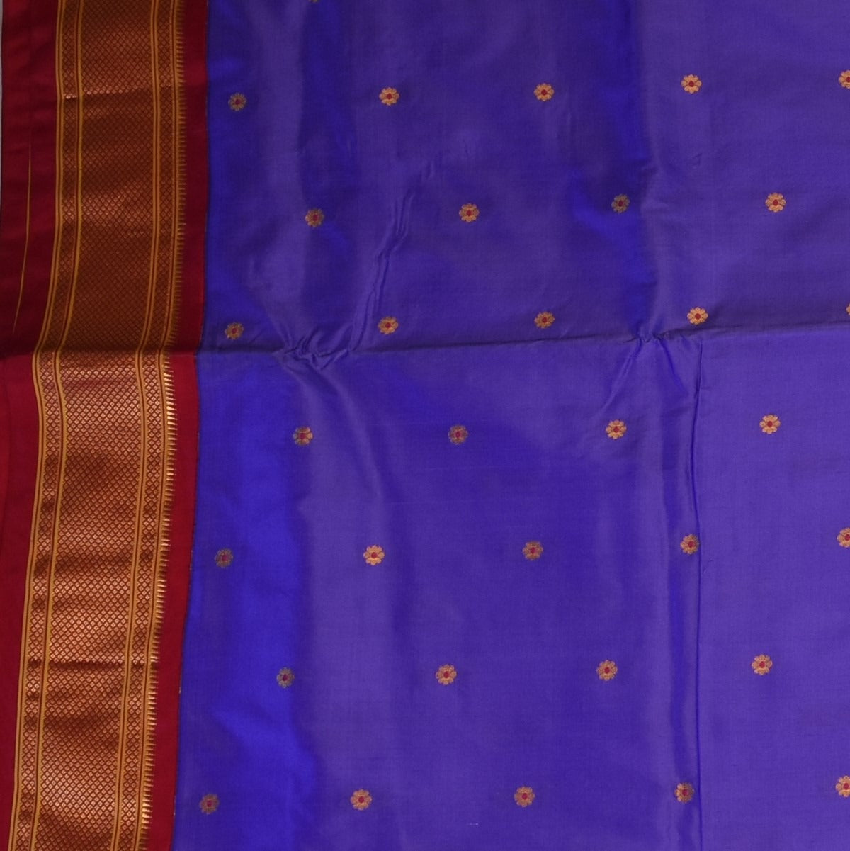 This Gadwal paithani pure silk saree in a violet shade exudes grace and sophistication. Designed with intricate traditional motifs, it is perfect for weddings, festive celebrations, and cultural events.