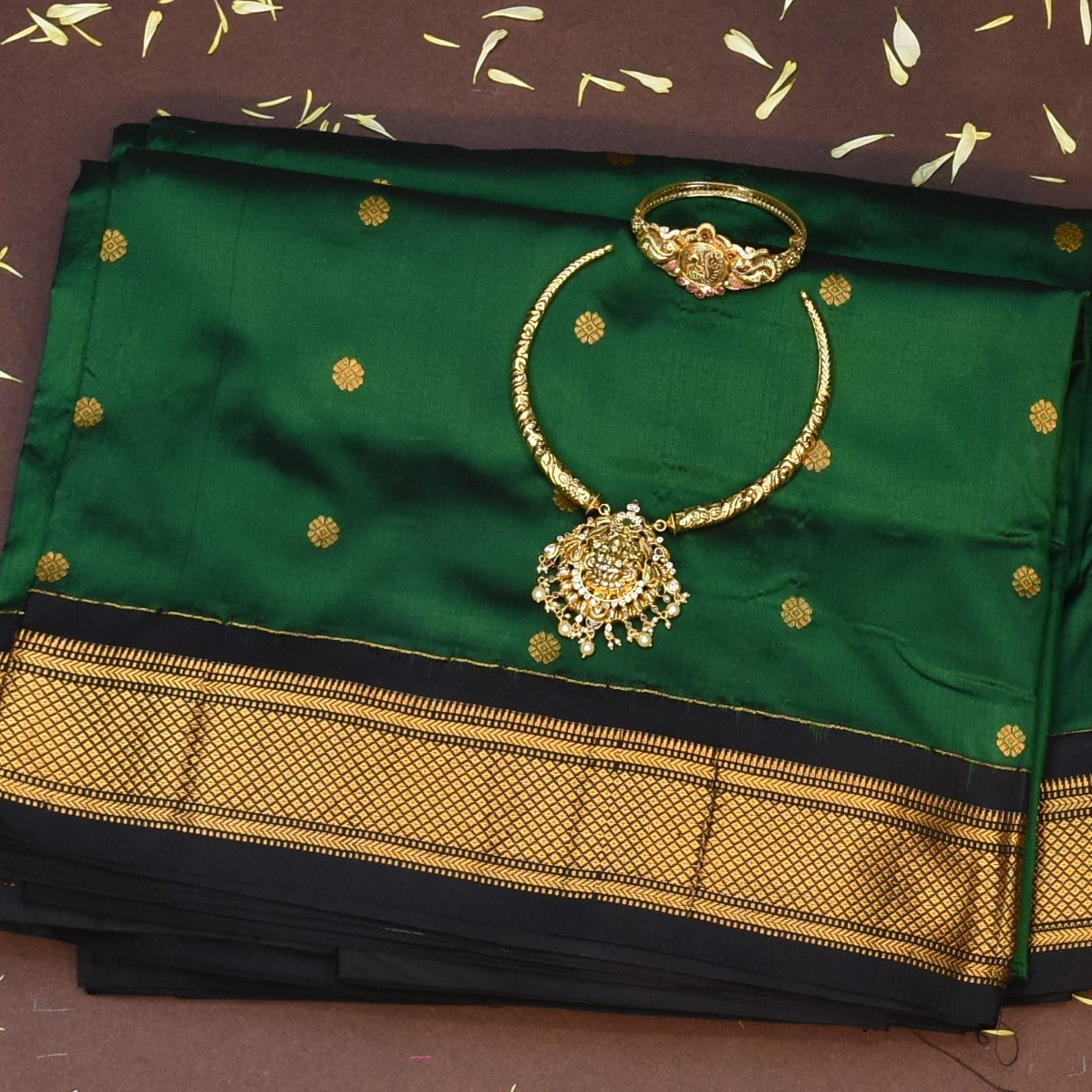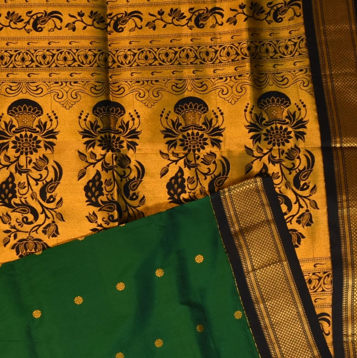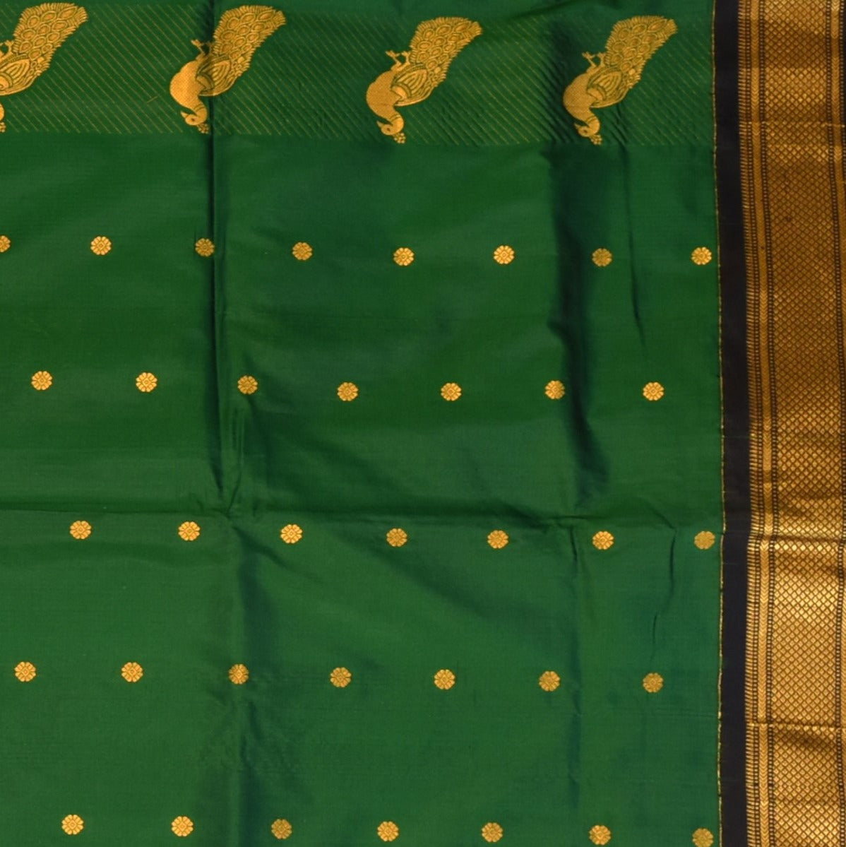 This Gadwal paithani pure silk saree in a forest green shade exudes grace and sophistication. Designed with intricate traditional motifs, it is perfect for weddings, festive celebrations, and cultural events.