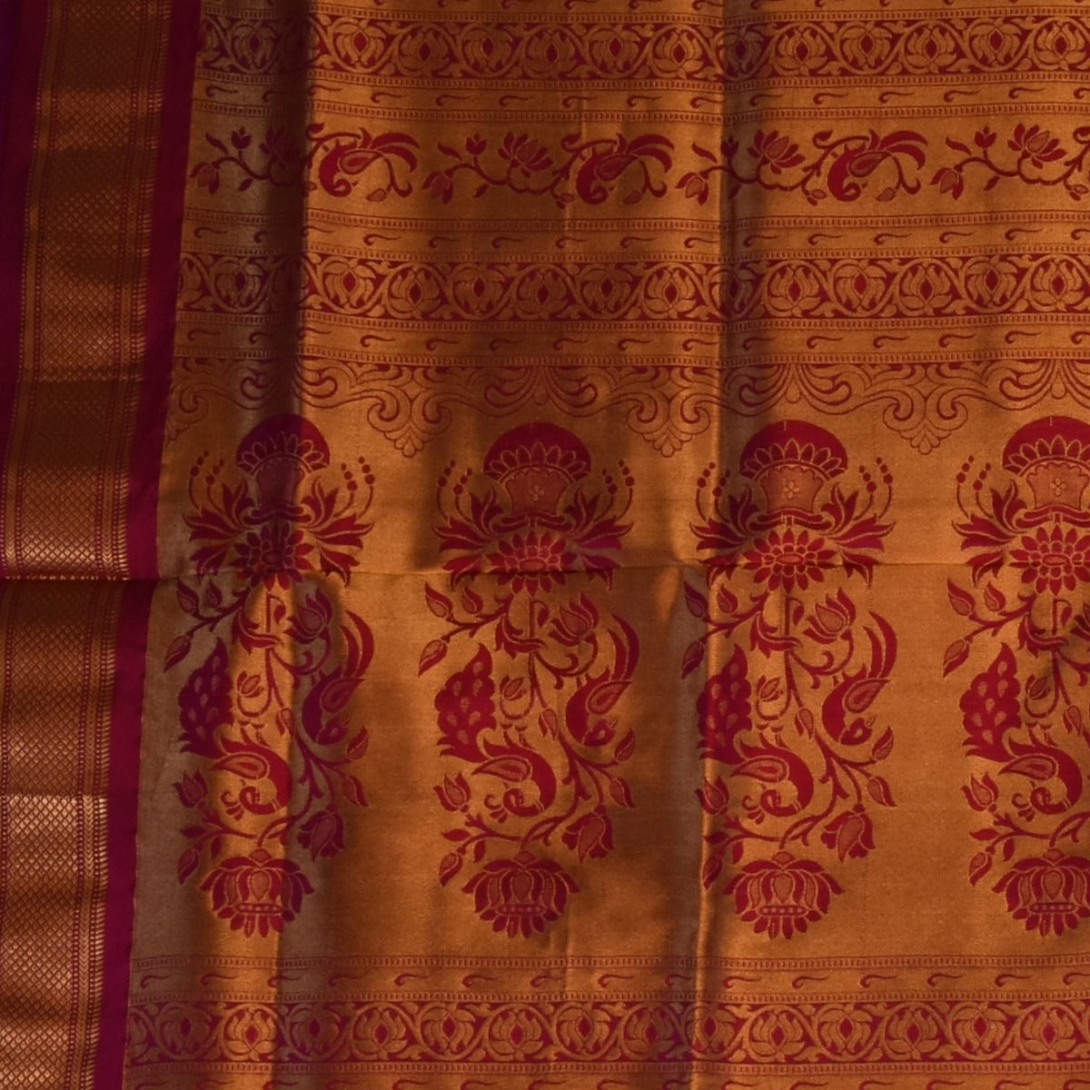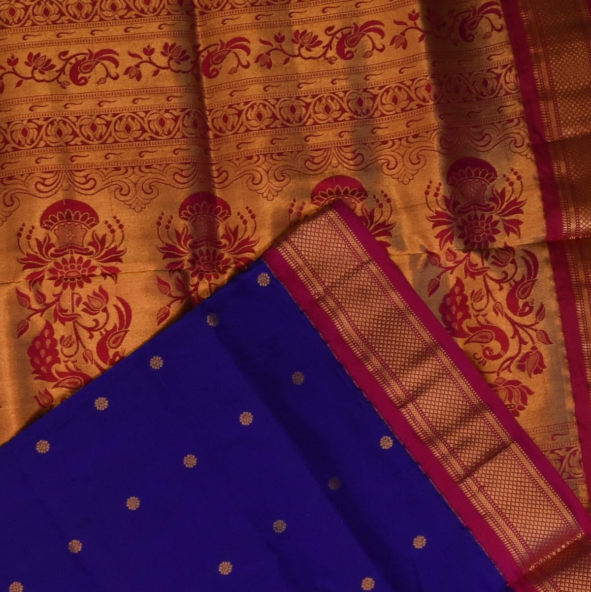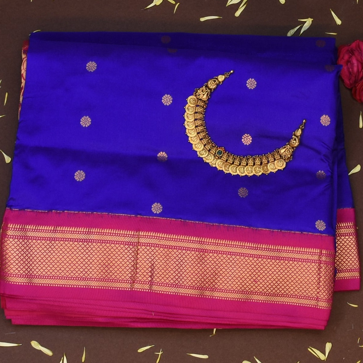 This Gadwal paithani pure silk saree in a royal indigo shade exudes grace and sophistication. Designed with intricate traditional motifs, it is perfect for weddings, festive celebrations, and cultural events.