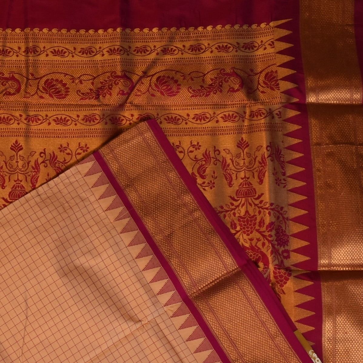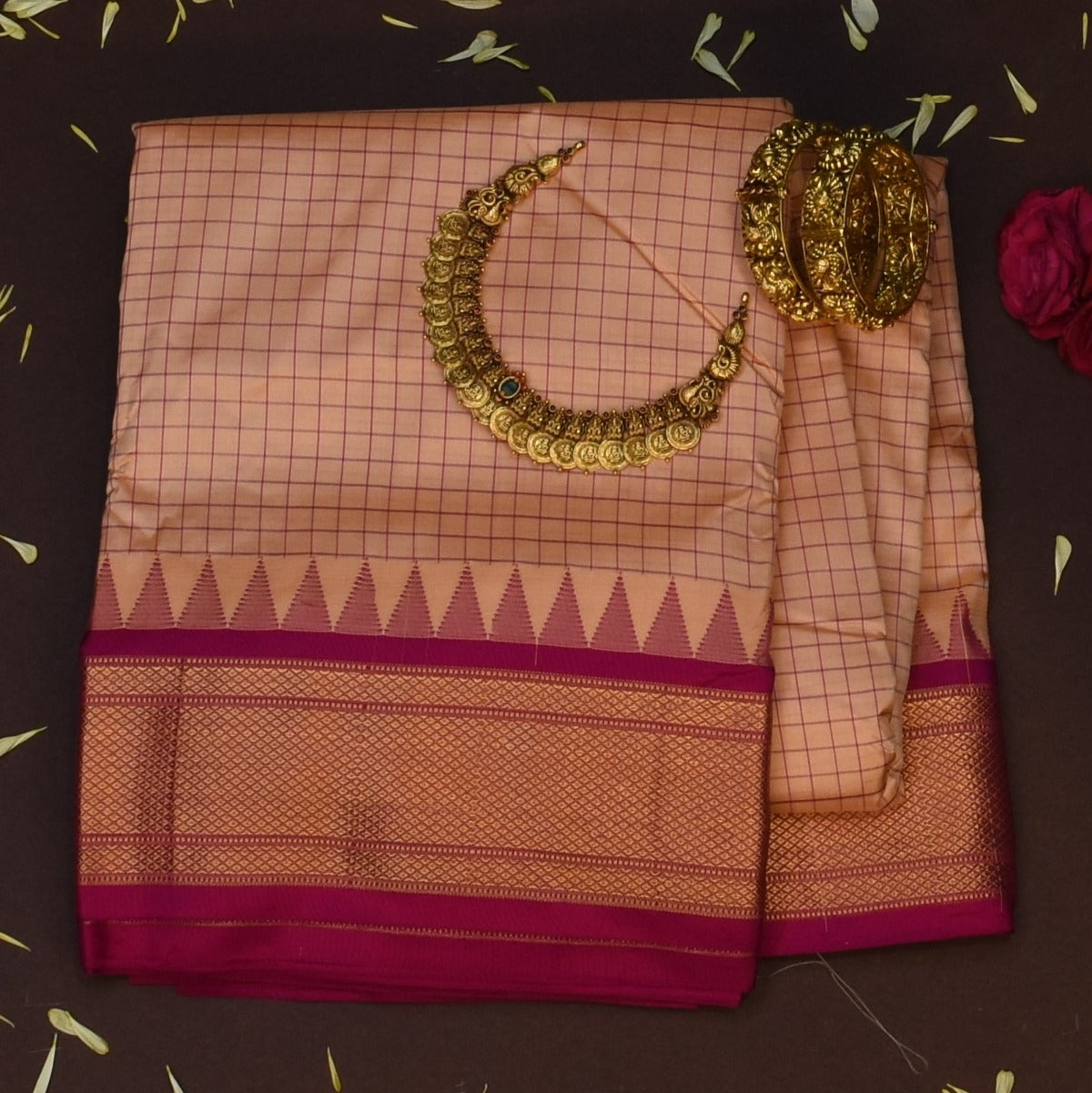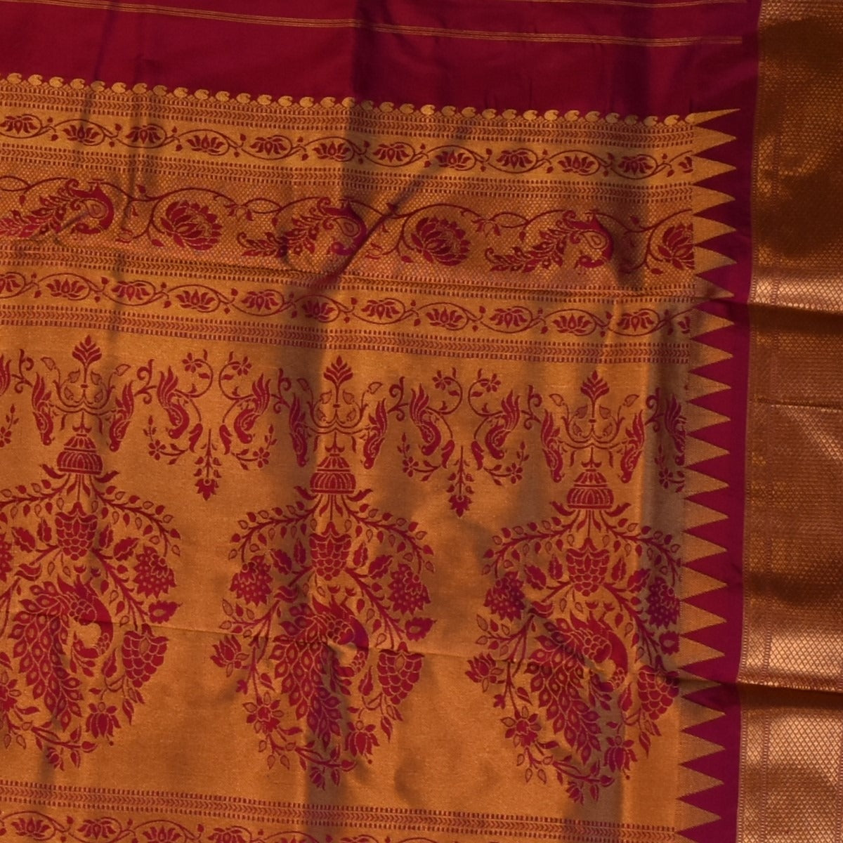 This Gadwal paithani pure silk saree in a soft caramel shade exudes grace and sophistication. Designed with intricate traditional motifs, it is perfect for weddings, festive celebrations, and cultural events.