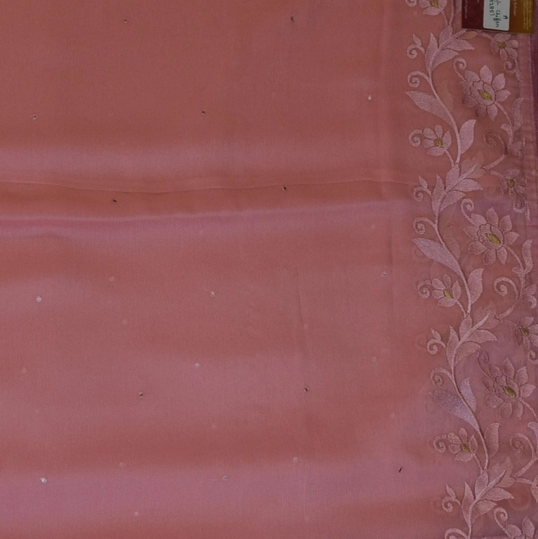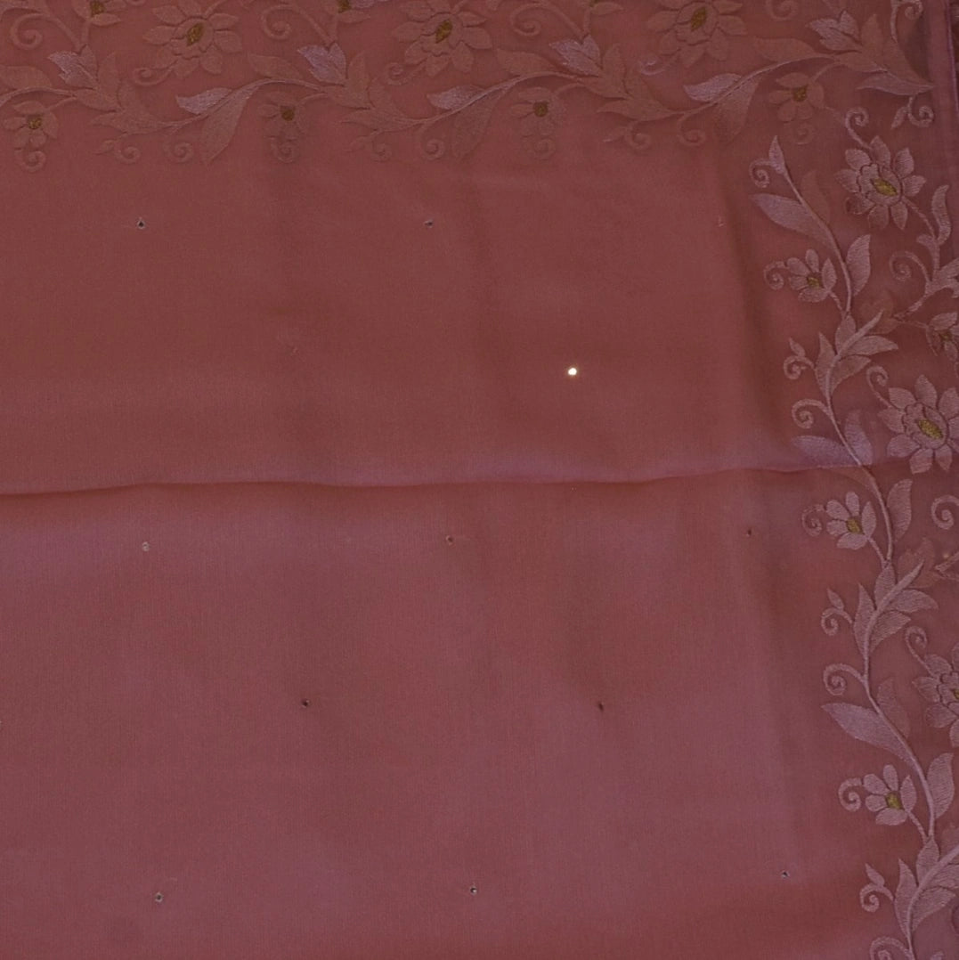 This chiffon saree in a dusty rose shade features elegant traditional patterns, perfect for graceful appearances and festive flair.