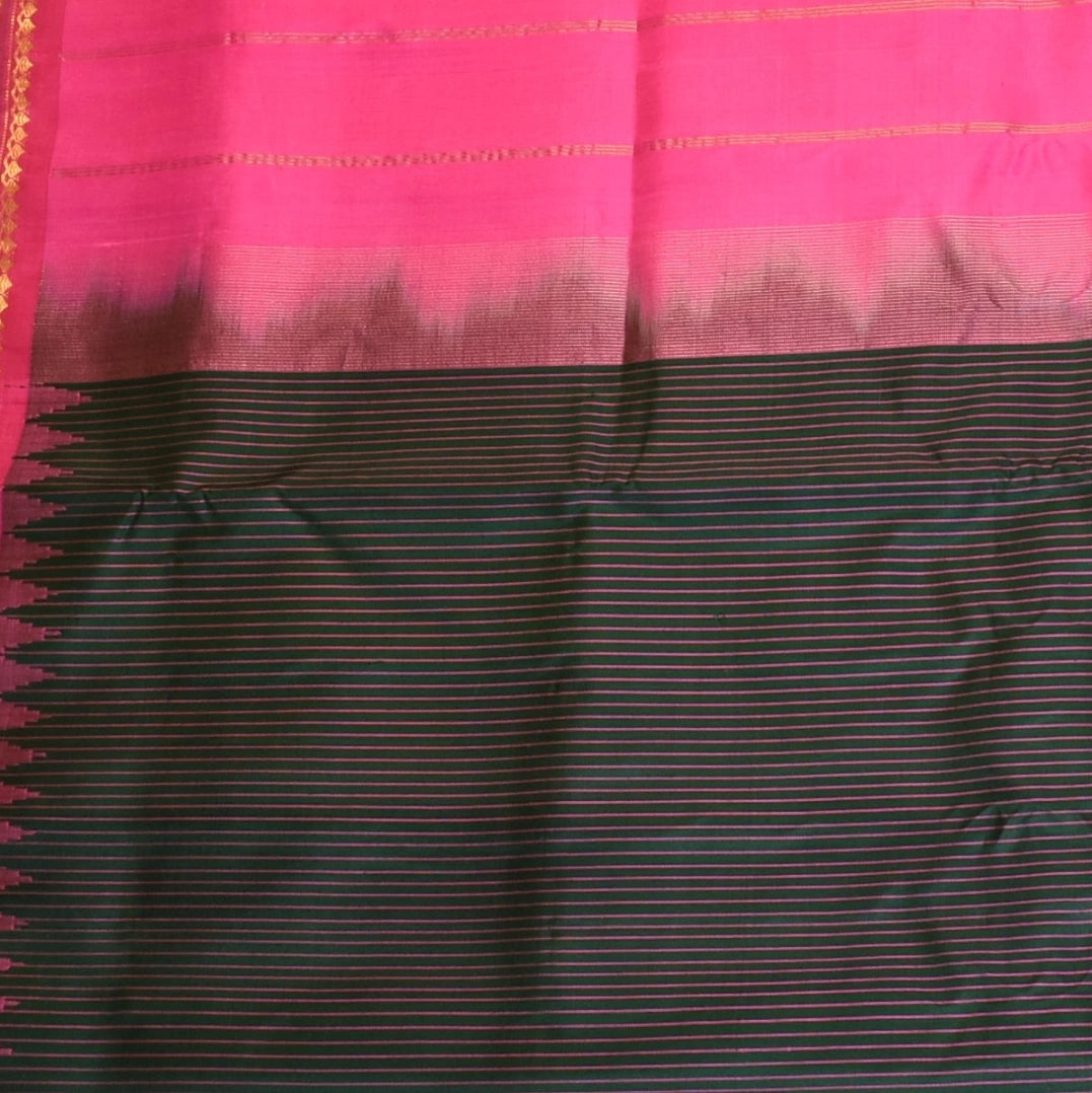 This pure gadwal silk saree in a half pink and half black shade shade features elegant traditional patterns, perfect for graceful appearances and festive flair.