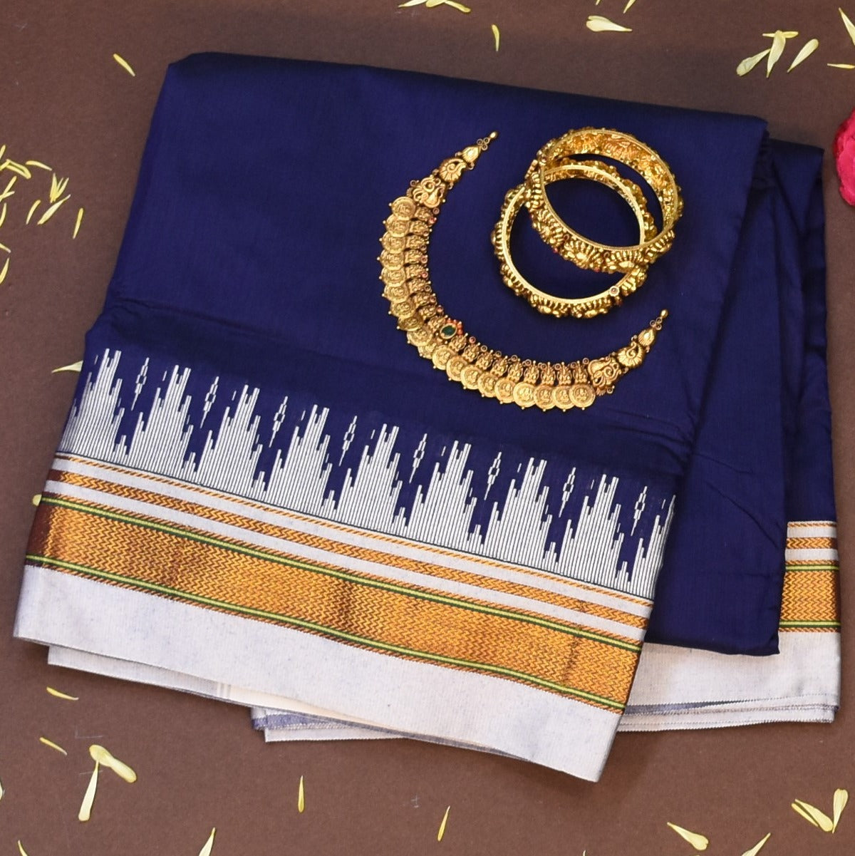 This Ilkal Cotton Semi saree in a deep navy shade exudes grace and sophistication. Designed with intricate traditional motifs, it is perfect for weddings, festive celebrations, and cultural events.