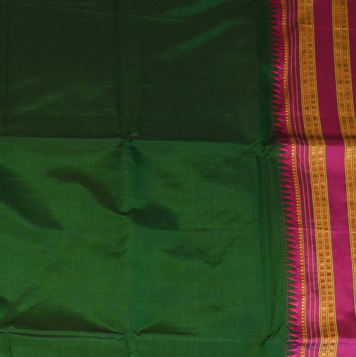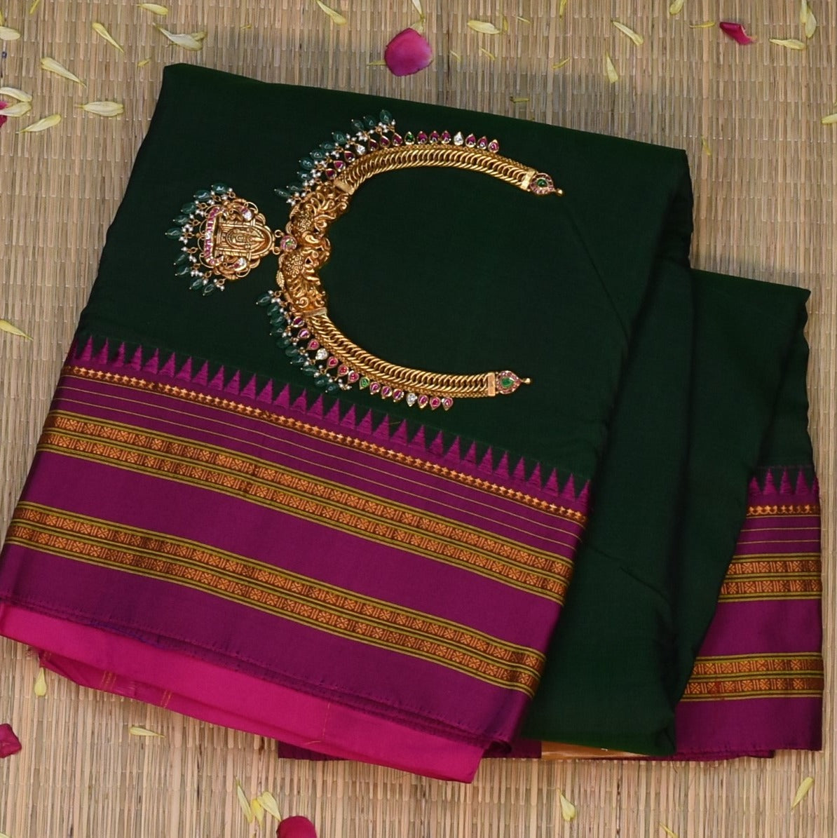 This Ilkal Cotton Silk saree in a deep forest green shade exudes grace and sophistication. Designed with intricate traditional motifs, it is perfect for weddings, festive celebrations, and cultural events.