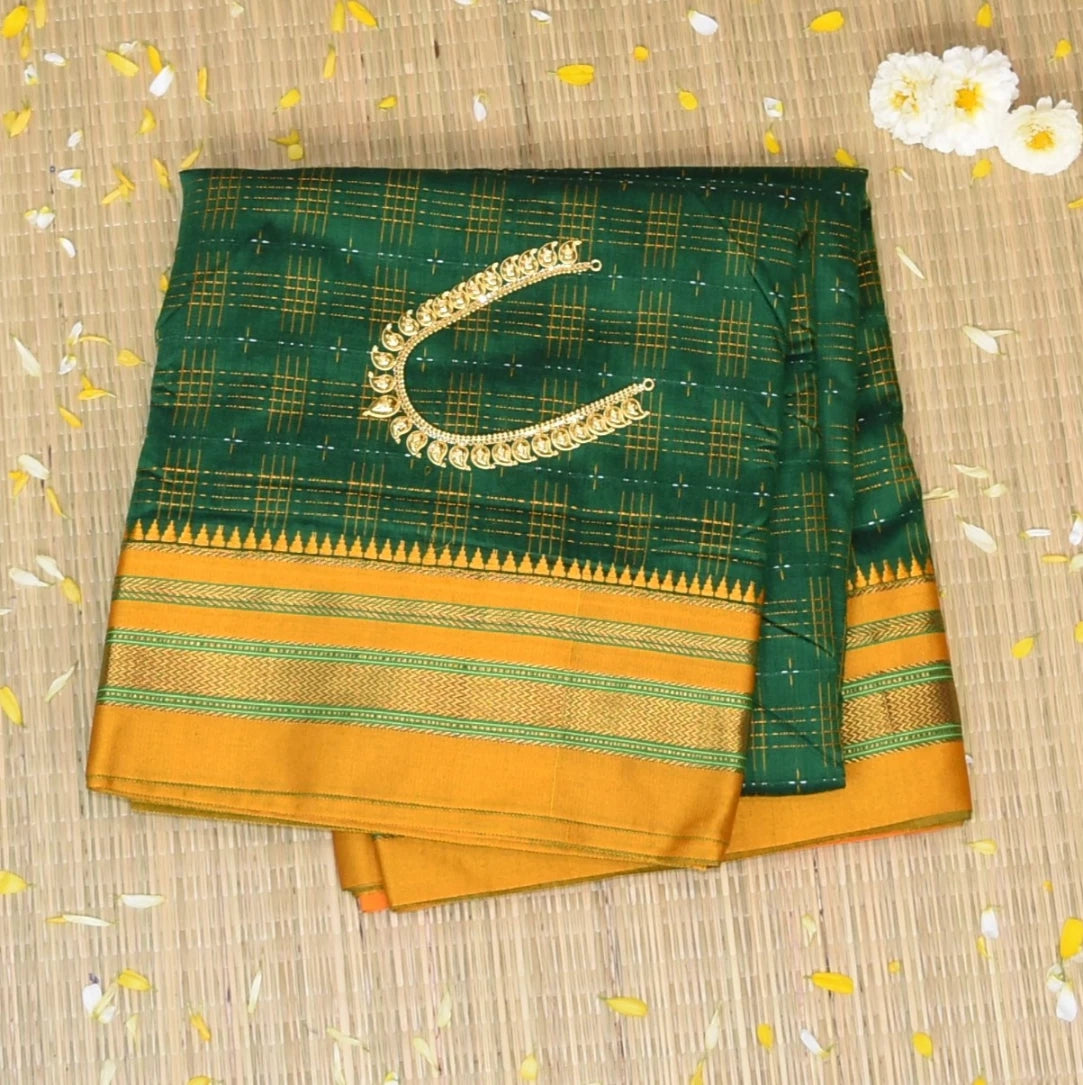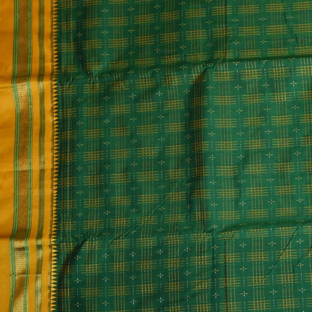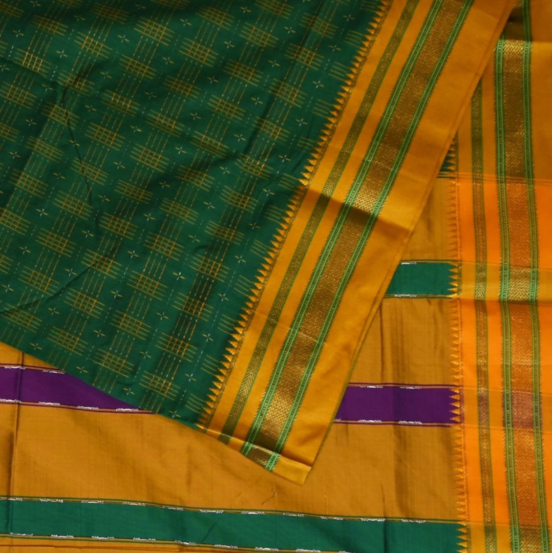 This ilkal cotton silk green saree with mustard border is a stunning piece with elegant details that elevate your traditional look. Perfect for celebrations, weddings, or festive wear.