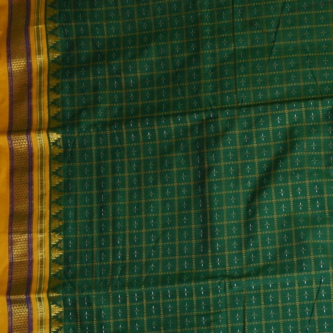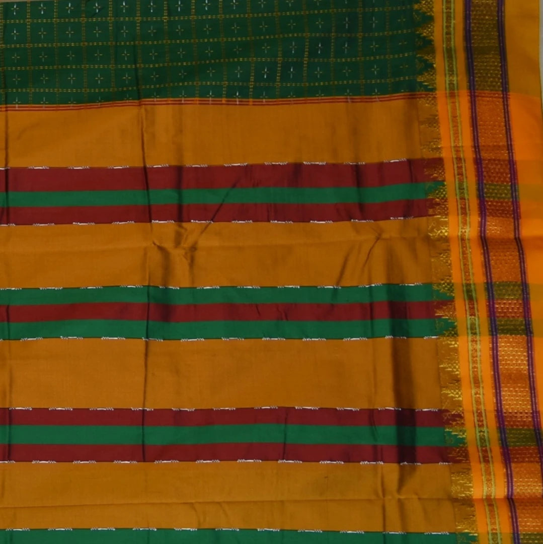 This ilkal cotton silk green saree with yellow border is a stunning piece with elegant details that elevate your traditional look. Perfect for celebrations, weddings, or festive wear.