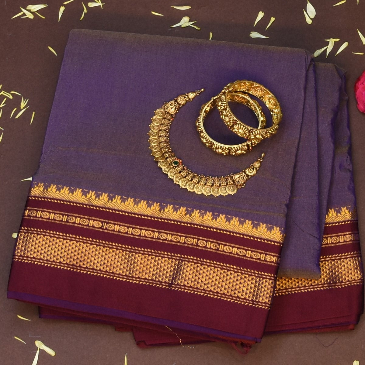 This Ilkal Cotton Silk saree in a plum purple shade exudes grace and sophistication. Designed with intricate traditional motifs, it is perfect for weddings, festive celebrations, and cultural events.