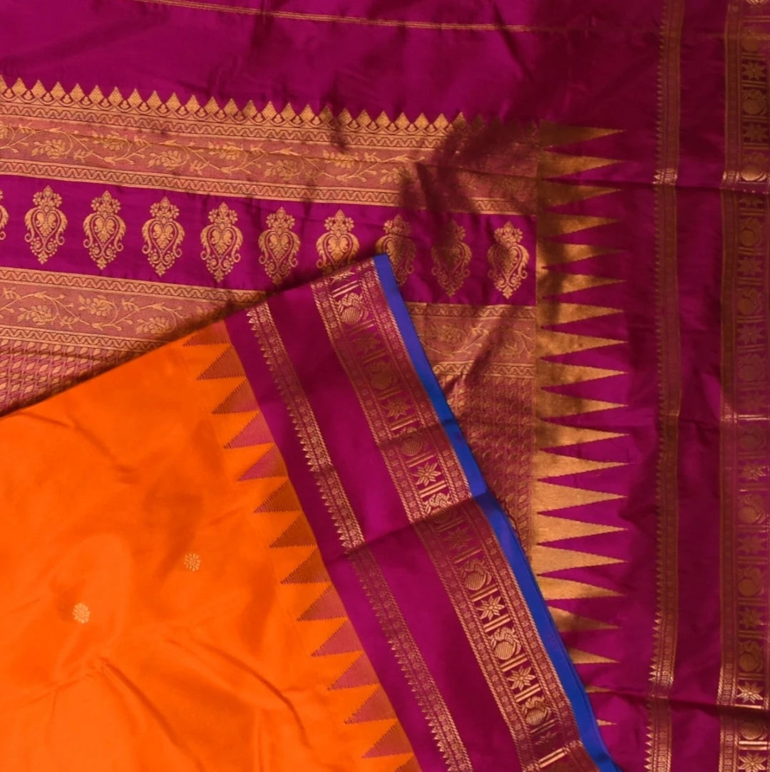 This ilkal gadwal silk orange saree pink jari boarder with blouse is a stunning piece with elegant details that elevate your traditional look. Perfect for celebrations, weddings, or festive wear.