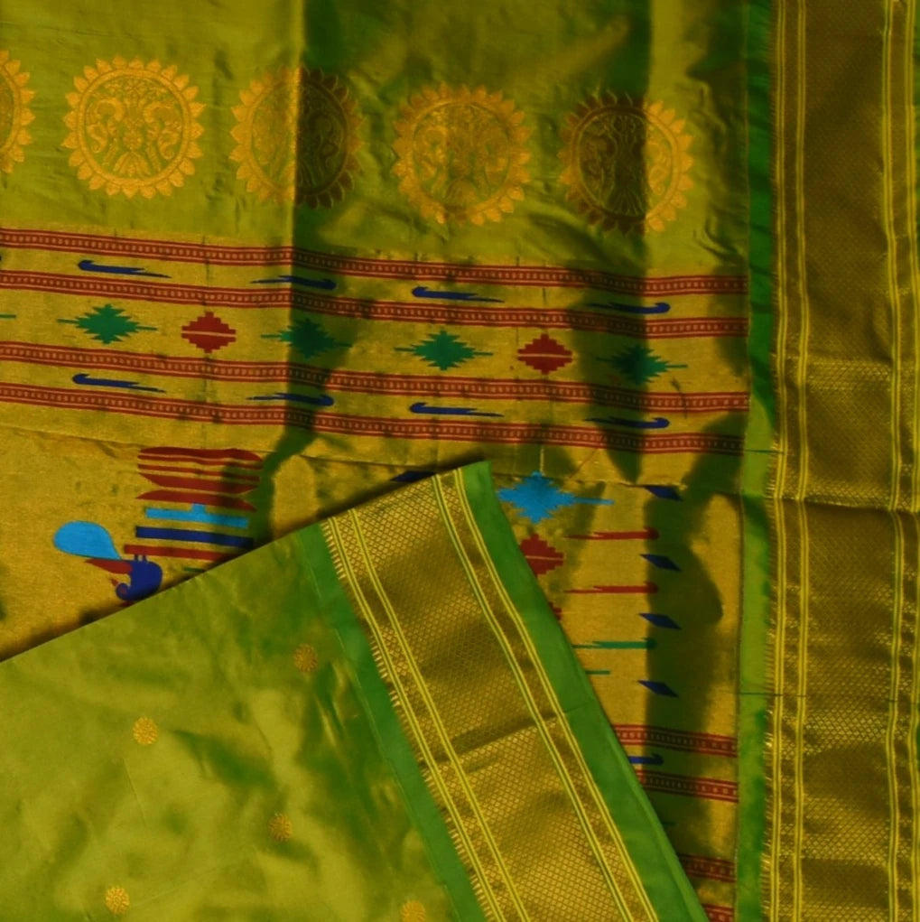 This ilkal gadwal silk paithani pallu rama green saree jai boarder with blouse is a stunning piece with elegant details that elevate your traditional look. Perfect for celebrations, weddings, or festive wear.