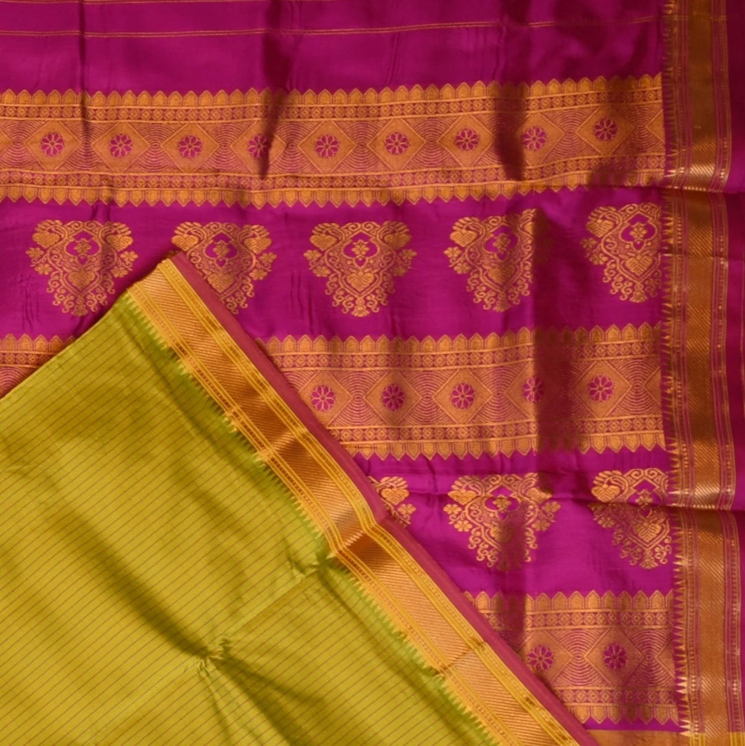 This ilkal pure silk lime green saree with zari border is a stunning piece with elegant details that elevate your traditional look. Perfect for celebrations, weddings, or festive wear.