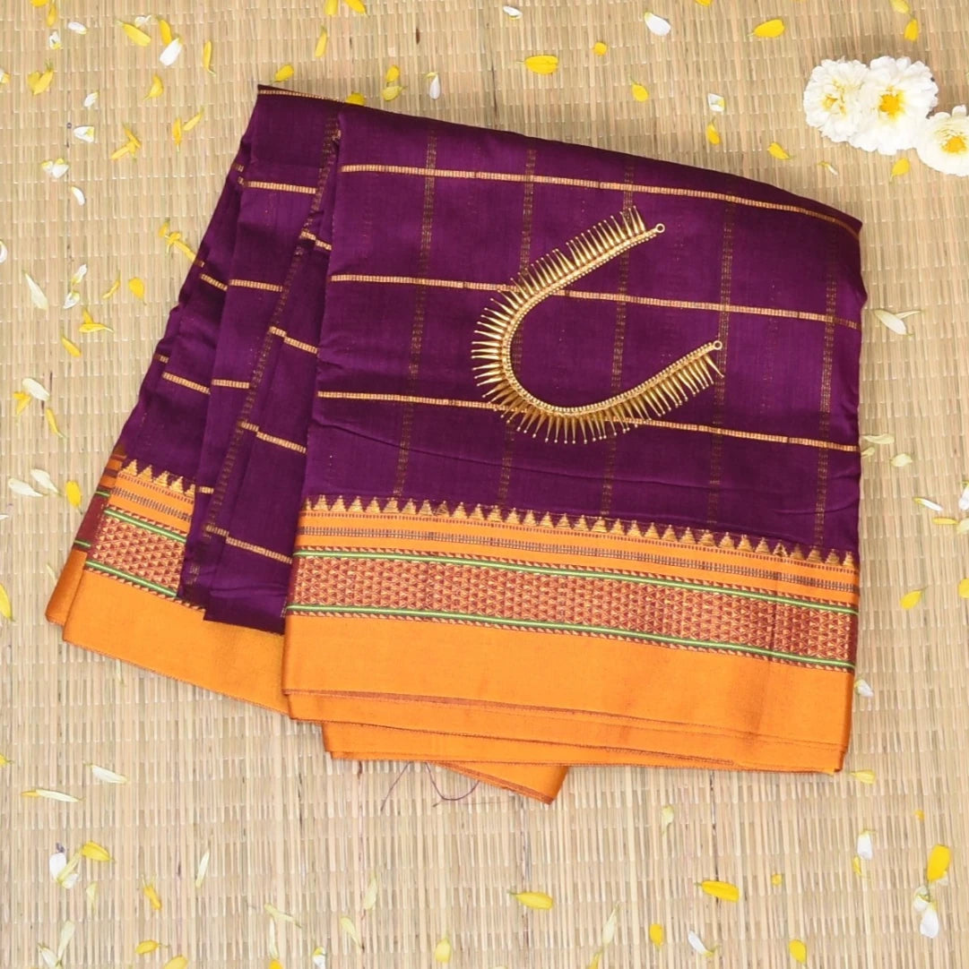 This ilkal silk cotton magenta saree with mustard border is a stunning piece with elegant details that elevate your traditional look. Perfect for celebrations, weddings, or festive wear.