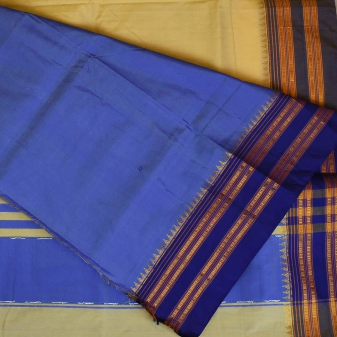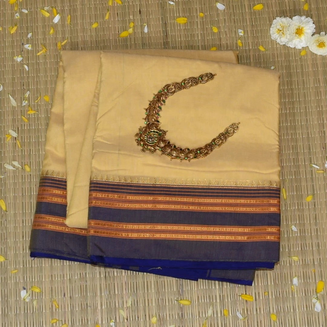 This ilkal silk cotton magnolia saree with blue grey border is a stunning piece with elegant details that elevate your traditional look. Perfect for celebrations, weddings, or festive wear.