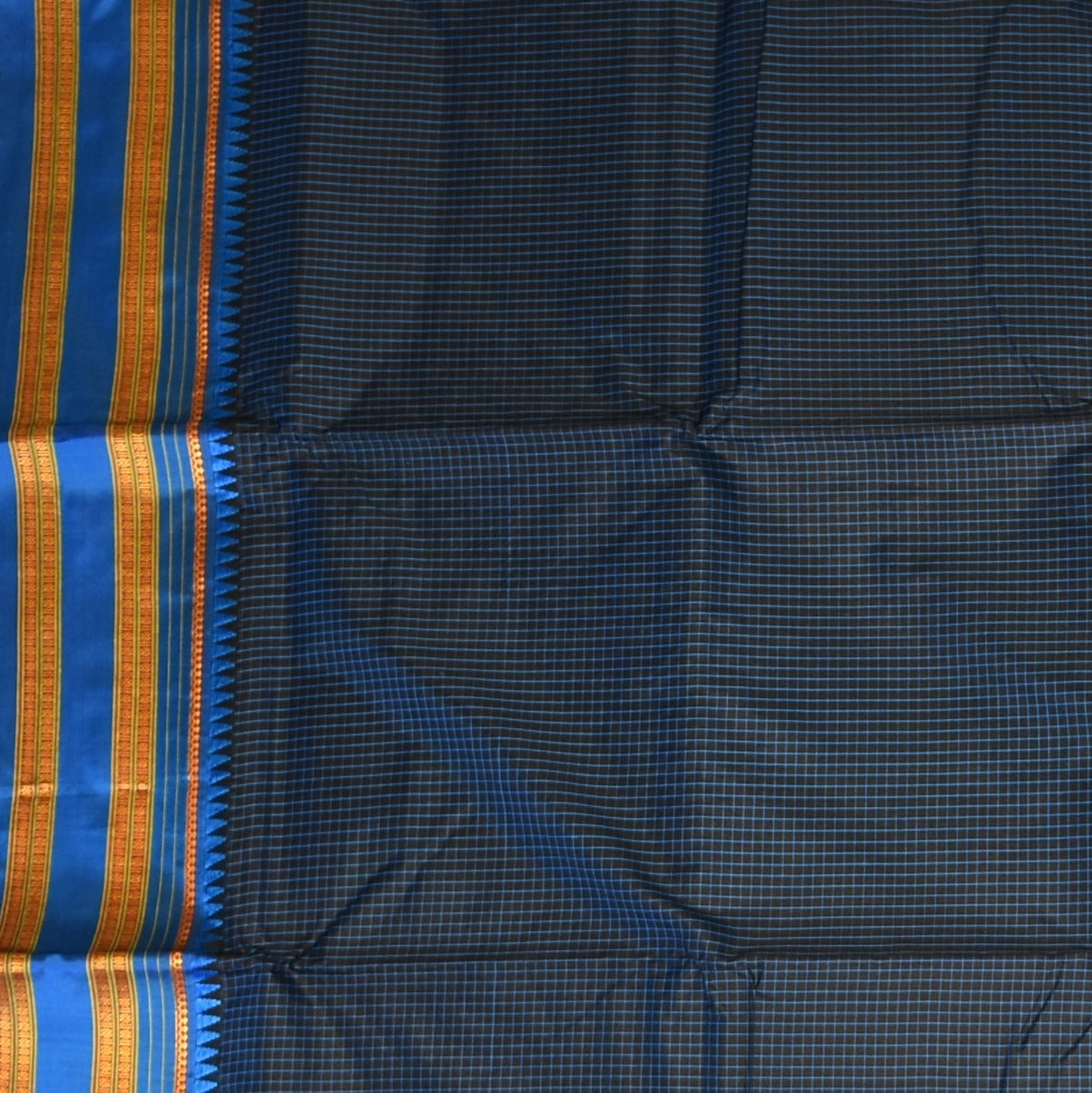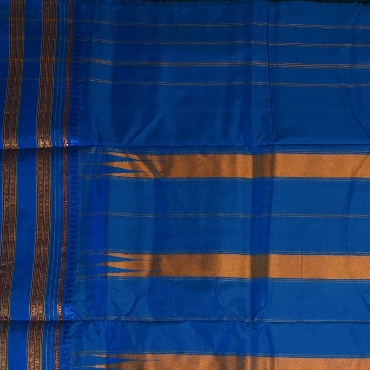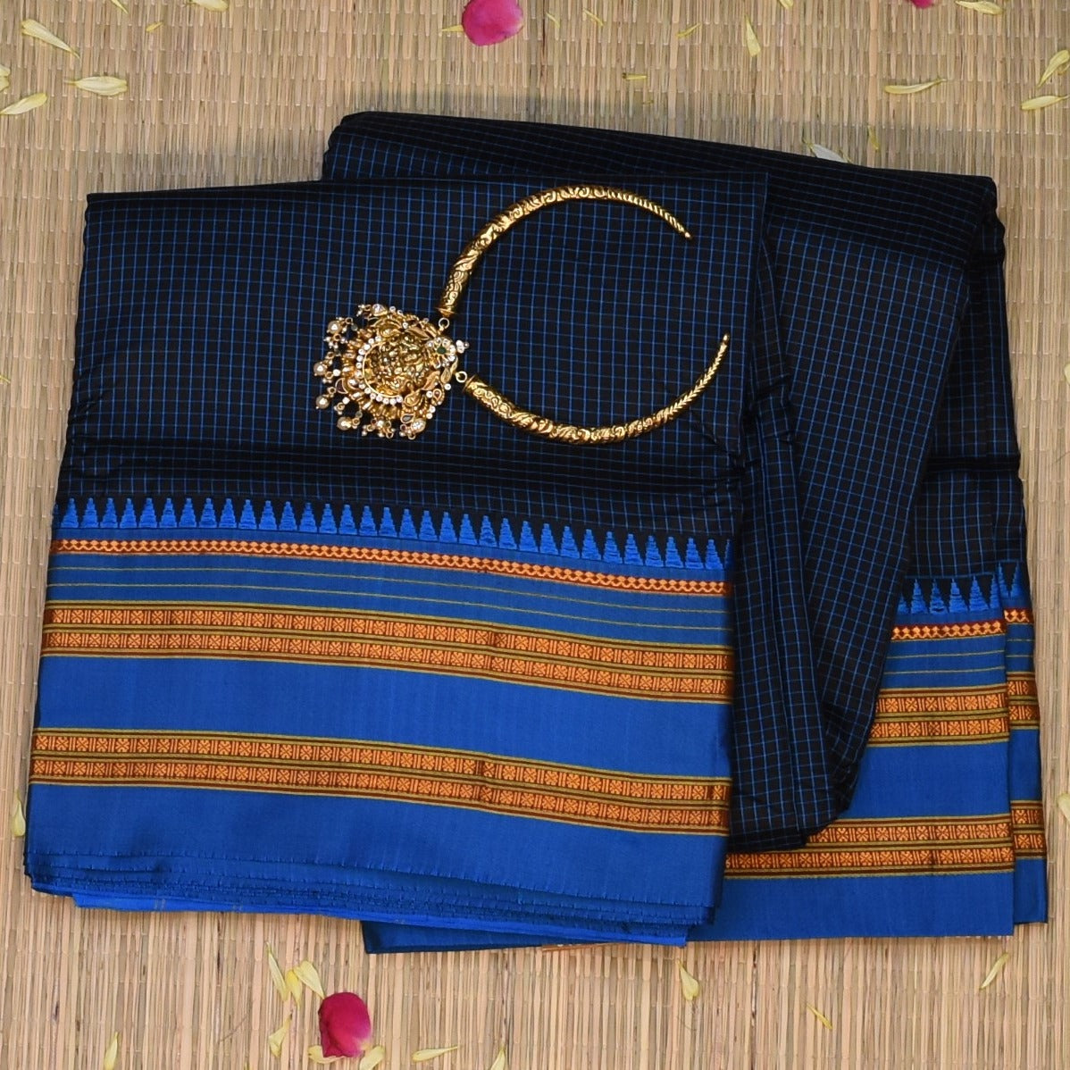 This Ilkal Silk saree in a navy teal shade exudes grace and sophistication. Designed with intricate traditional motifs, it is perfect for weddings, festive celebrations, and cultural events.