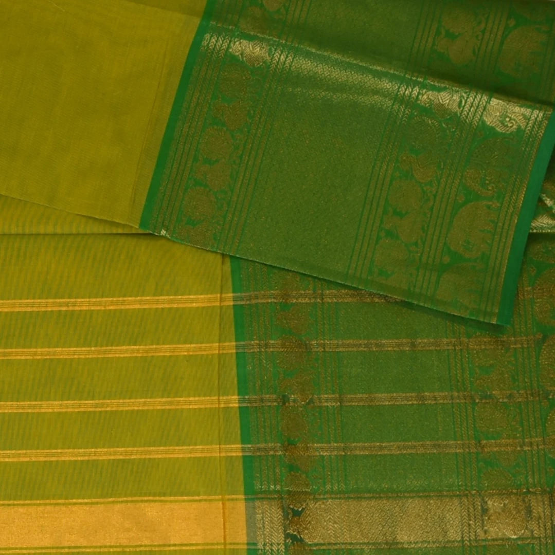 This kanchi cotton lemon green saree with zari border is a stunning piece with elegant details that elevate your traditional look. Perfect for celebrations, weddings, or festive wear.