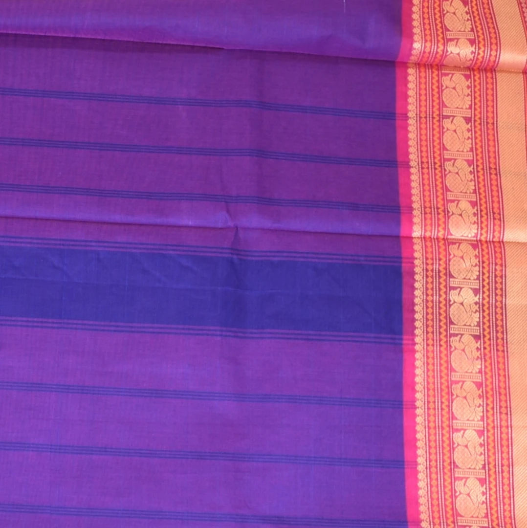 This kanchi cotton violet saree with pink threadwork border is a stunning piece with elegant details that elevate your traditional look. Perfect for celebrations, weddings, or festive wear.