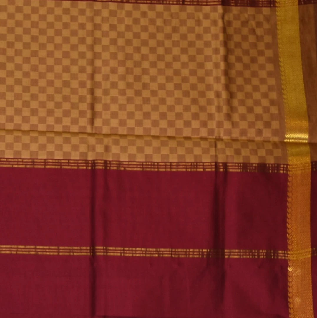 This kanchi semi cotton brown checks saree with zari borde is a stunning piece with elegant details that elevate your traditional look. Perfect for celebrations, weddings, or festive wear.