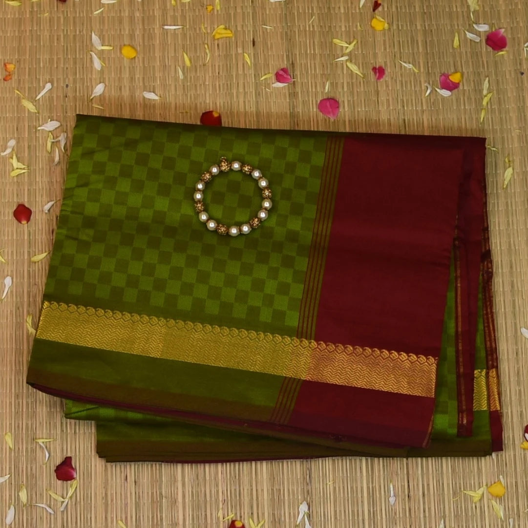 This kanchi semi cotton green check saree with zari border is a stunning piece with elegant details that elevate your traditional look. Perfect for celebrations, weddings, or festive wear.