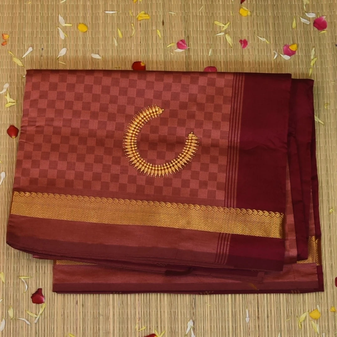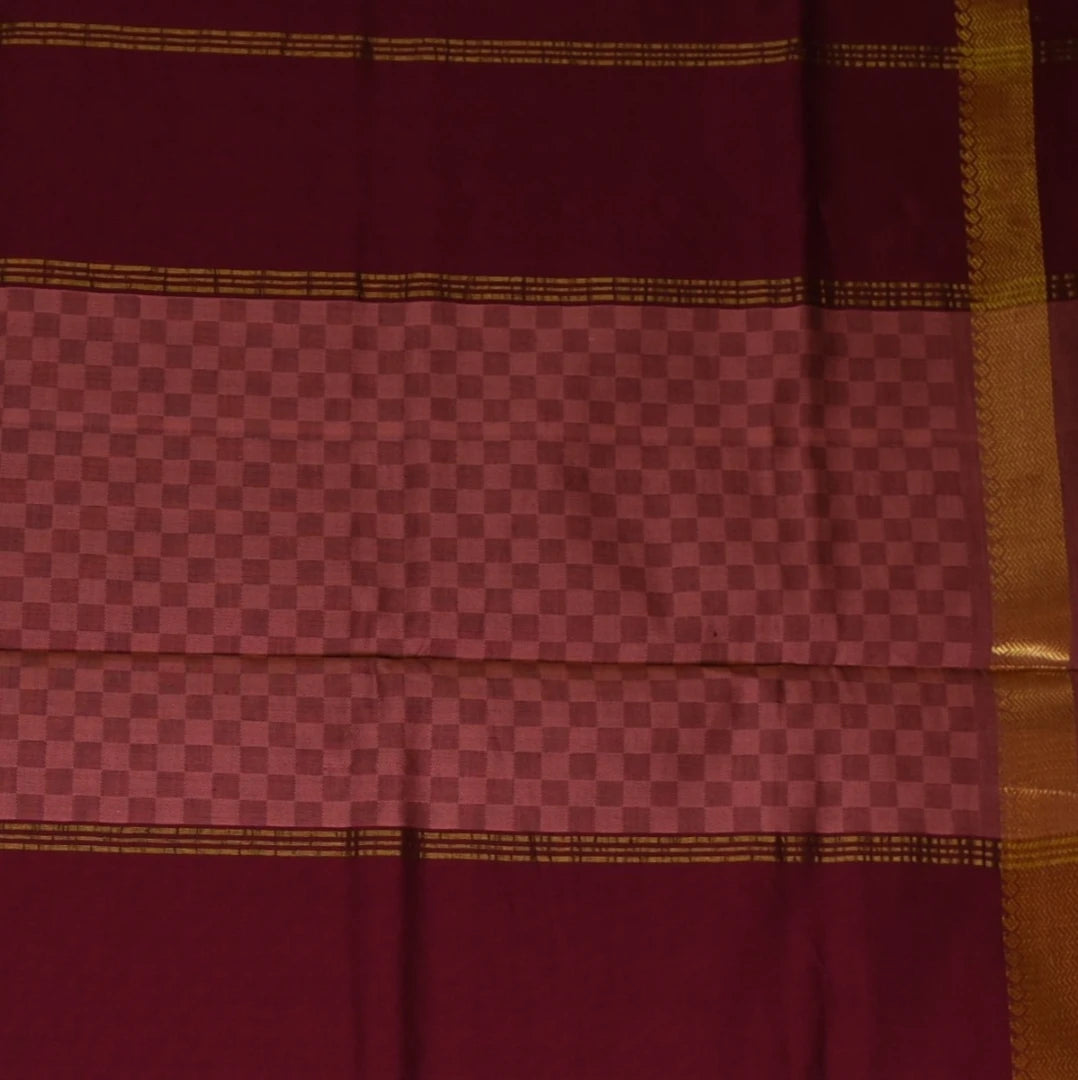 This kanchi semi cotton peach checks saree with zari border is a stunning piece with elegant details that elevate your traditional look. Perfect for celebrations, weddings, or festive wear.