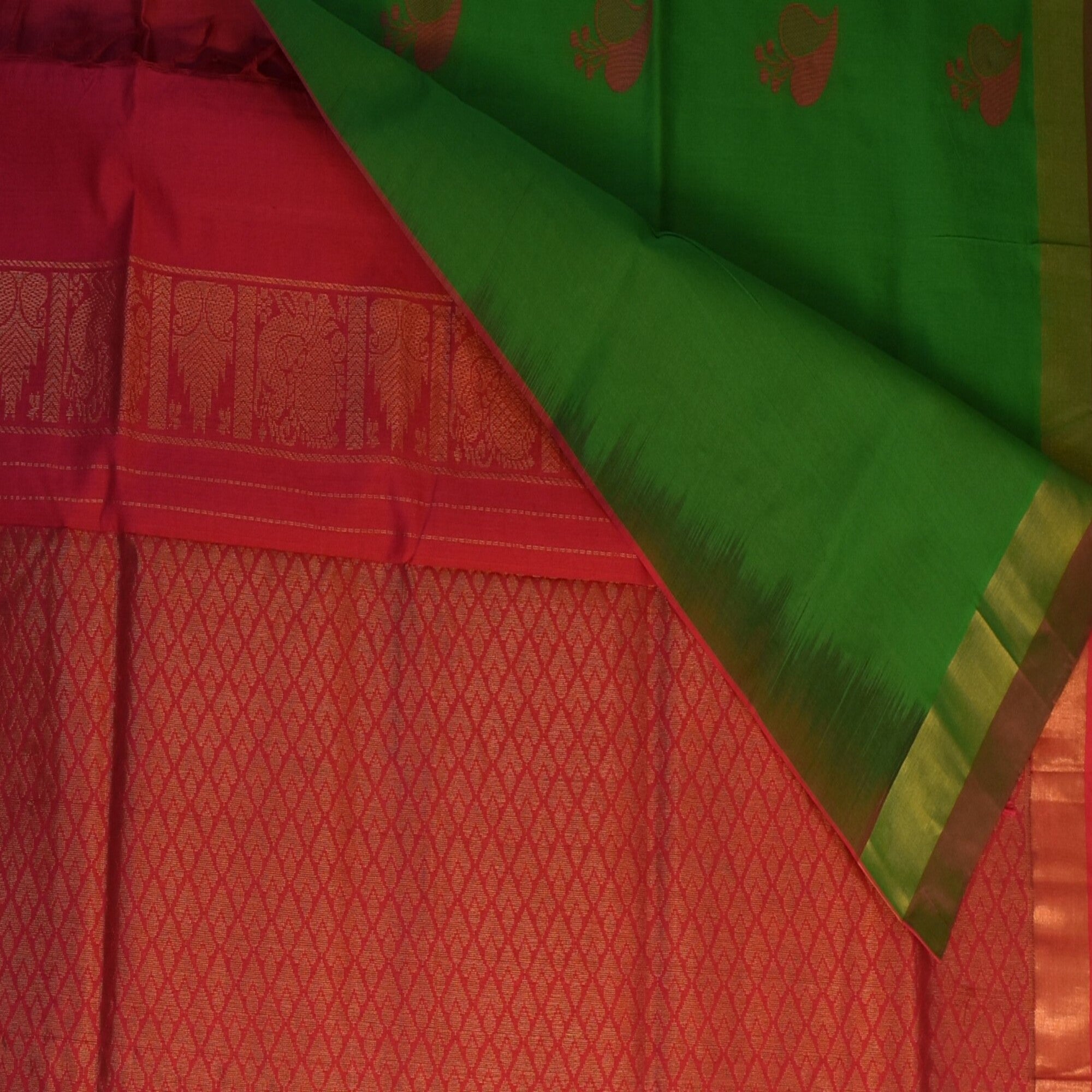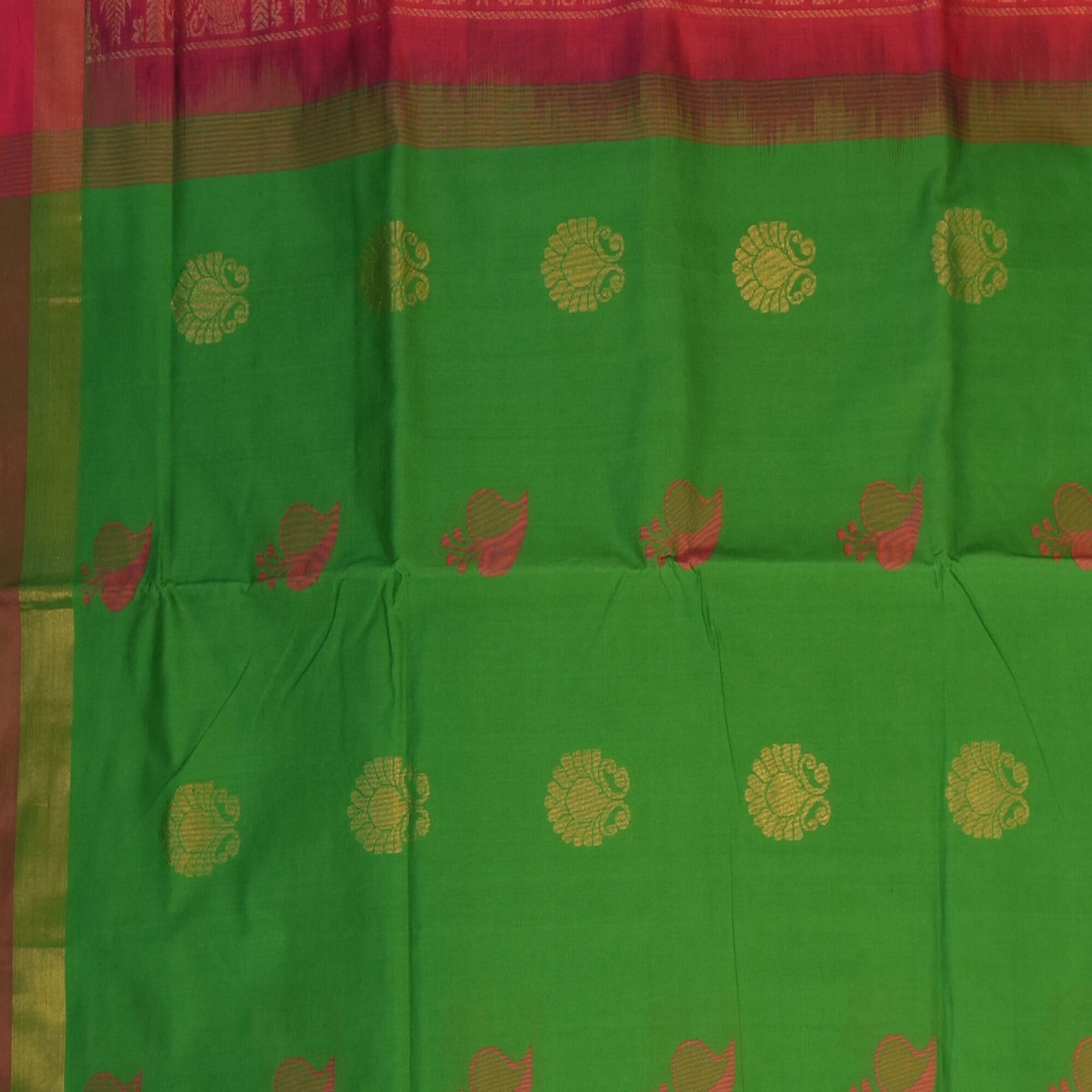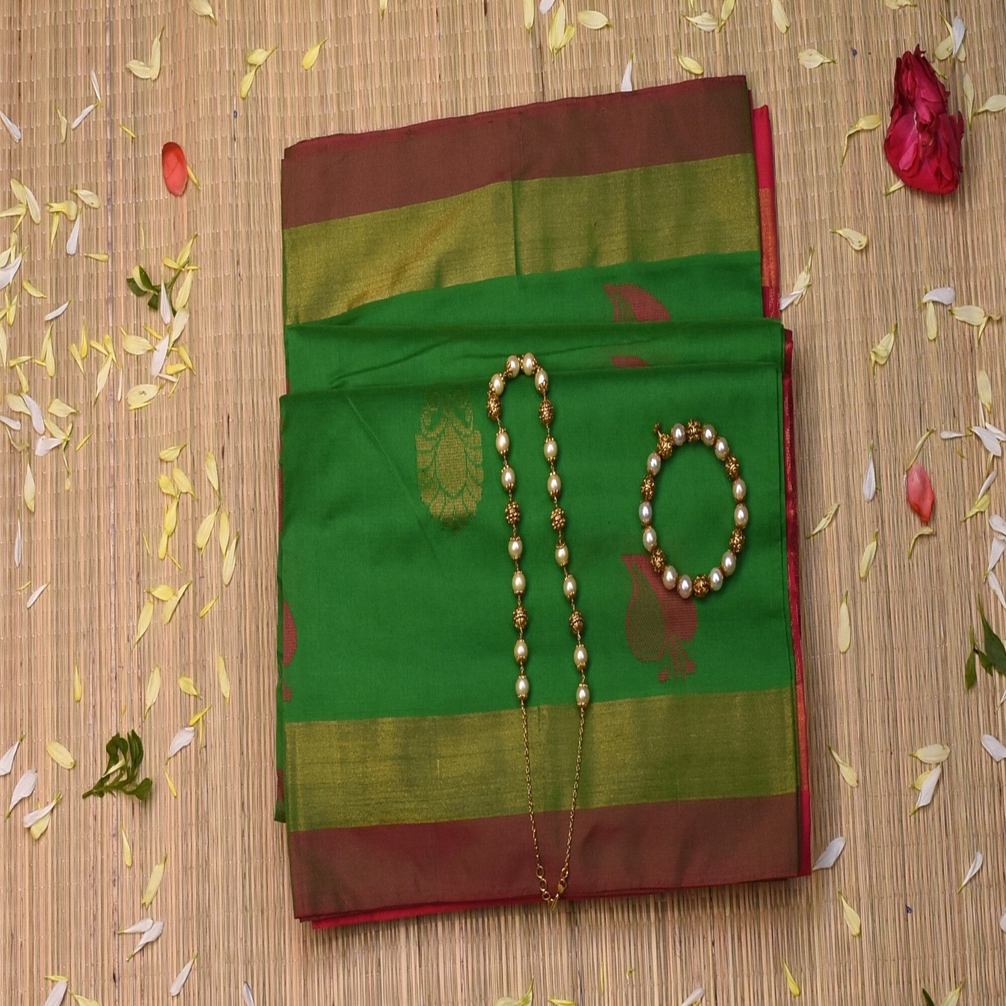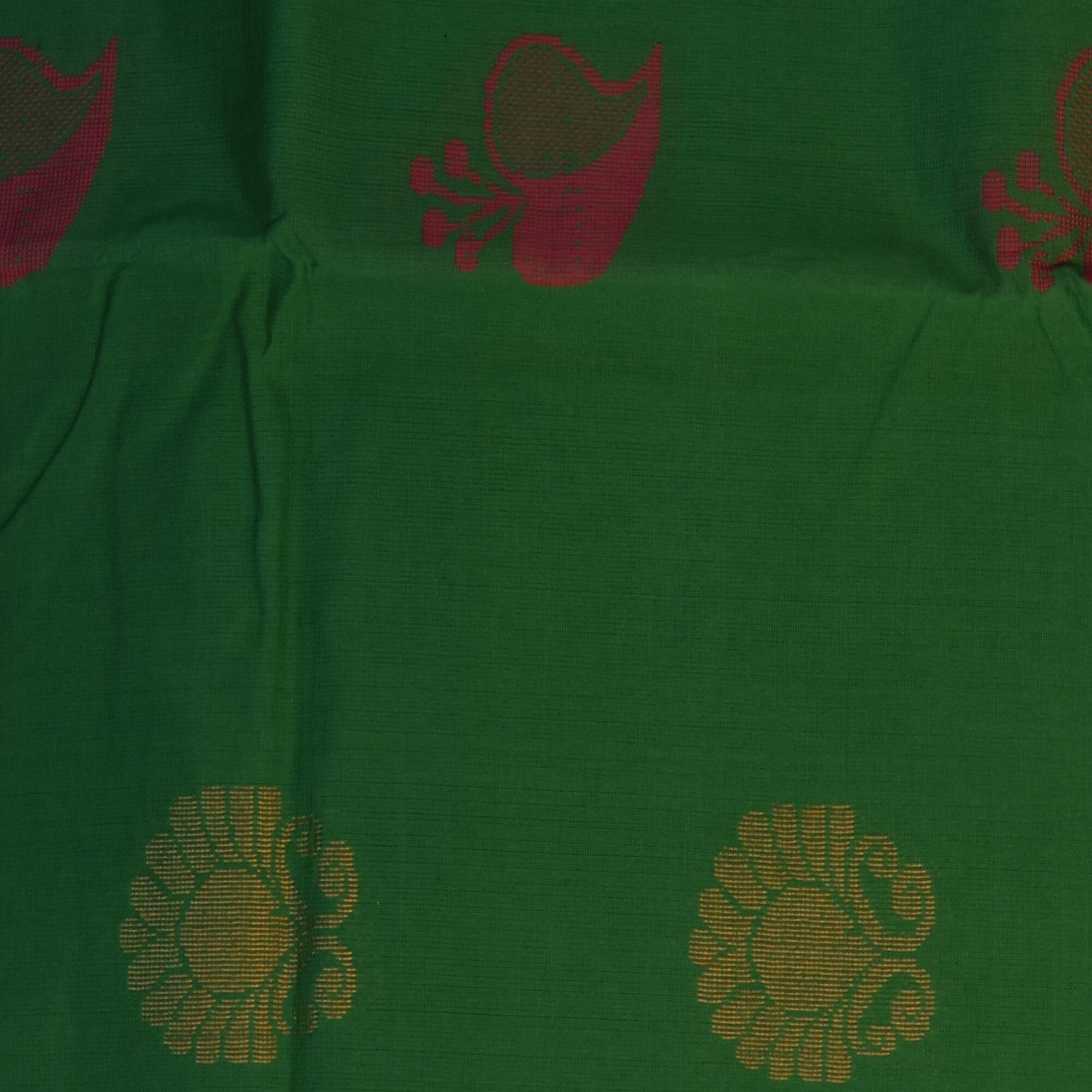 This kanchi silk cotton green saree with blouse. The fabric breathes effortlessly while retaining a regal texture. This is perfect for festivals, pujas, casual wear and graceful day wear.