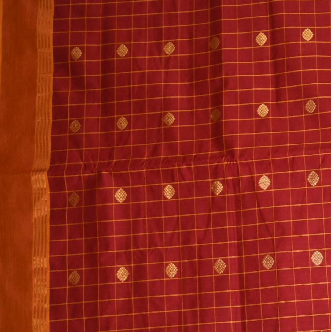 This kanchi silk cotton red saree with mustard yellow border is a stunning piece with elegant details that elevate your traditional look. Perfect for celebrations, weddings, or festive wear.