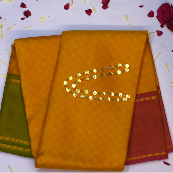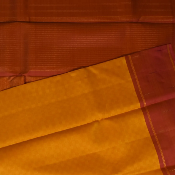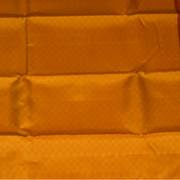 This Kanchipuram silk saree in a amber shade is a masterpiece of elegance. Perfectly crafted with intricate traditional patterns, it is ideal for weddings, festive occasions, and grand celebrations.