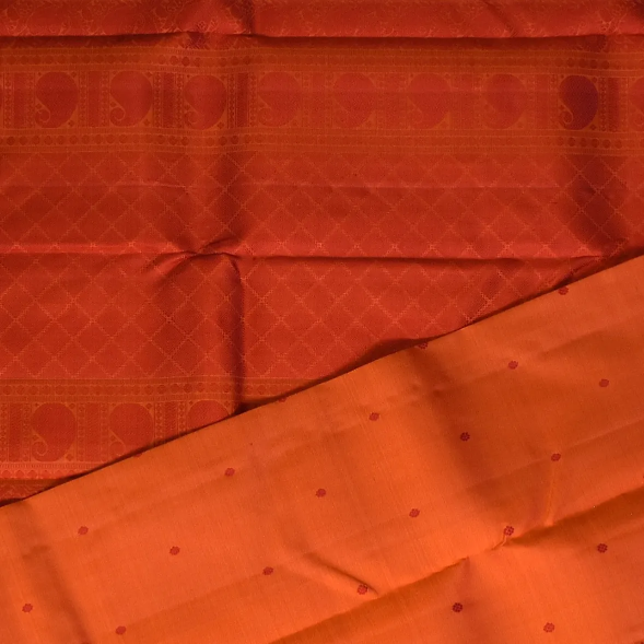 This Kanchipuram silk saree in a cantaloupe orange shade is a masterpiece of elegance. Perfectly crafted with intricate traditional patterns, it is ideal for weddings, festive occasions, and grand celebrations.