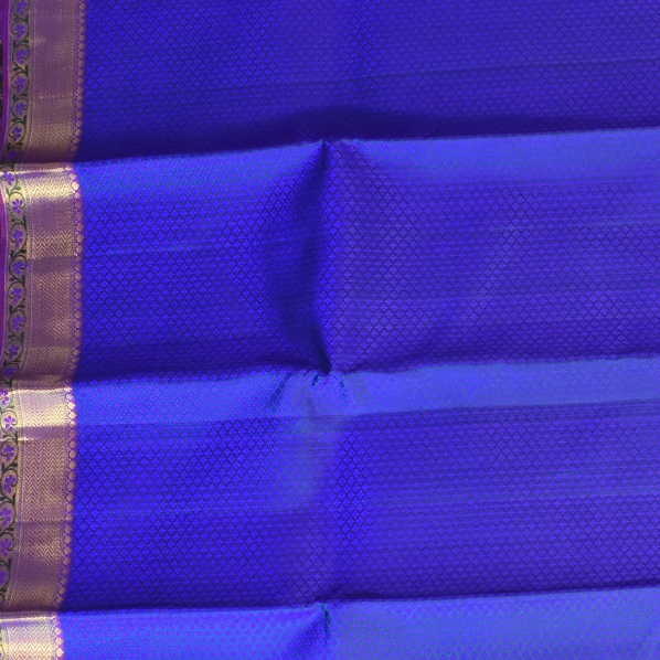 This Kanchipuram silk saree in a electric indigo shade is a masterpiece of elegance. Perfectly crafted with intricate traditional patterns, it is ideal for weddings, festive occasions, and grand celebrations.