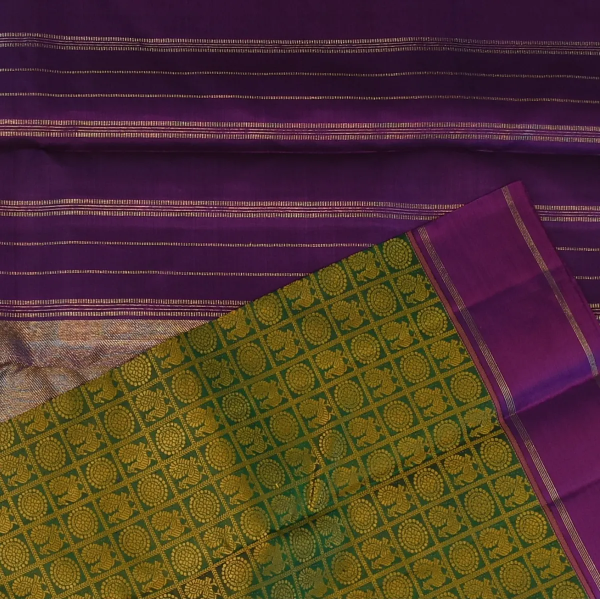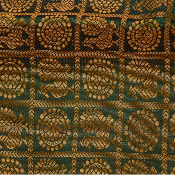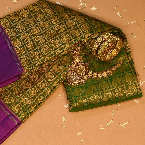 This Kanchipuram silk saree in a forest green & goldenrod shade is a masterpiece of elegance. Perfectly crafted with intricate traditional patterns, it is ideal for weddings, festive occasions, and grand celebrations.