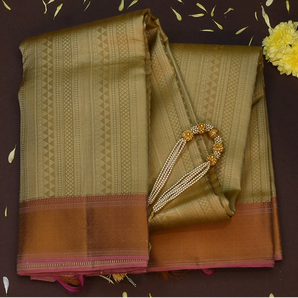 This Kanchipuram silk saree in a khaki brown shade is a masterpiece of elegance. Perfectly crafted with intricate traditional patterns, it is ideal for weddings, festive occasions, and grand celebrations.