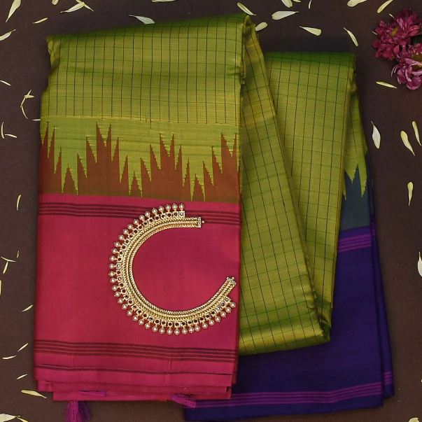 This Kanchipuram silk saree in a olive drab shade is a masterpiece of elegance. Perfectly crafted with intricate traditional patterns, it is ideal for weddings, festive occasions, and grand celebrations.