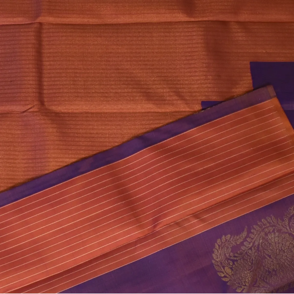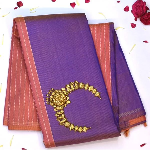 This Kanchipuram silk saree in a royal purple shade is a masterpiece of elegance. Perfectly crafted with intricate traditional patterns, it is ideal for weddings, festive occasions, and grand celebrations.
