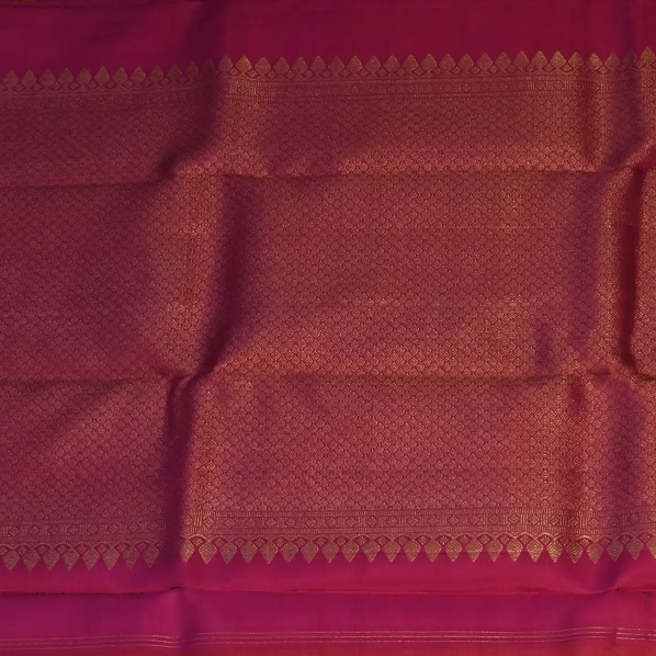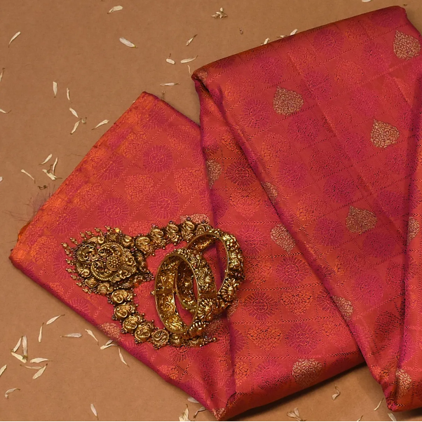 This Kanchipuram silk saree in a terra cotta shade is a masterpiece of elegance. Perfectly crafted with intricate traditional patterns, it is ideal for weddings, festive occasions, and grand celebrations.
