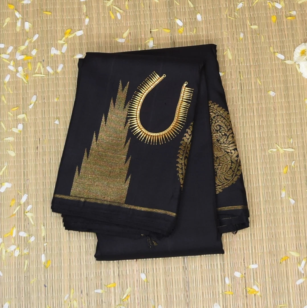 This kanchivaram pure silk black saree is a stunning piece with elegant details that elevate your traditional look. Perfect for celebrations, weddings, or festive wear.
