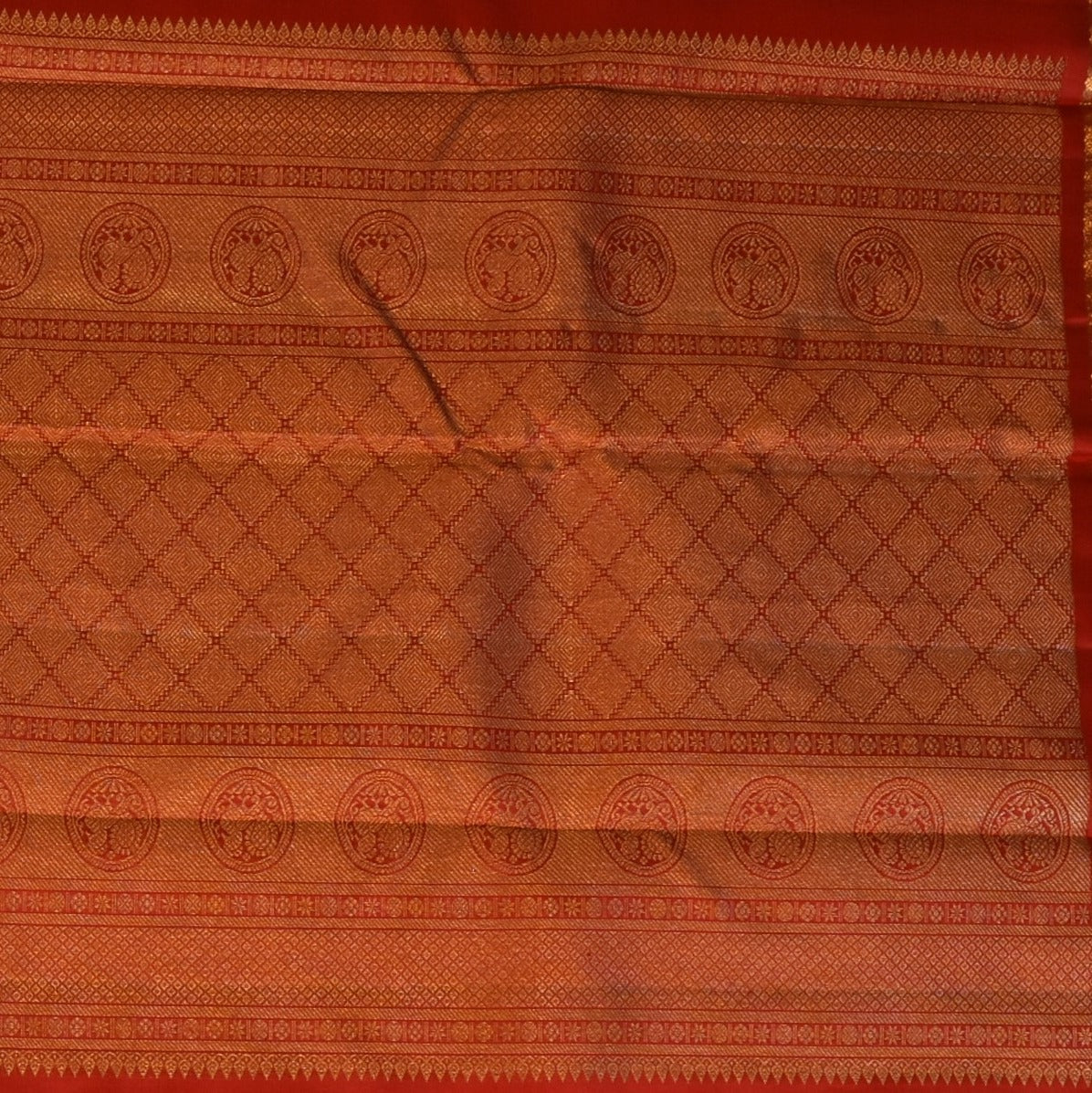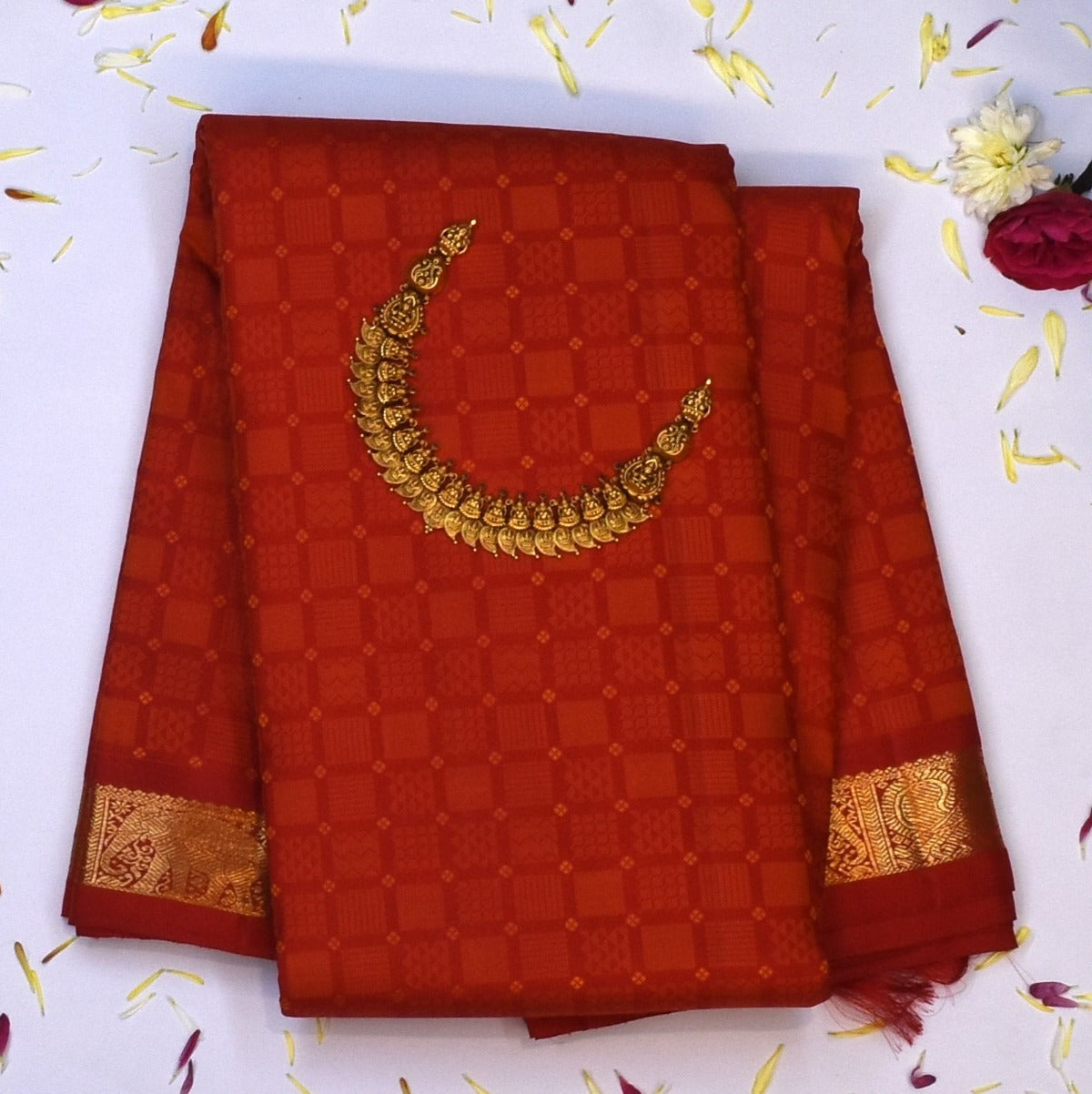 This Kanchivaram silk saree in a fiery red shade exudes grace and sophistication. Designed with intricate traditional motifs, it is perfect for weddings, festive celebrations, and cultural events.