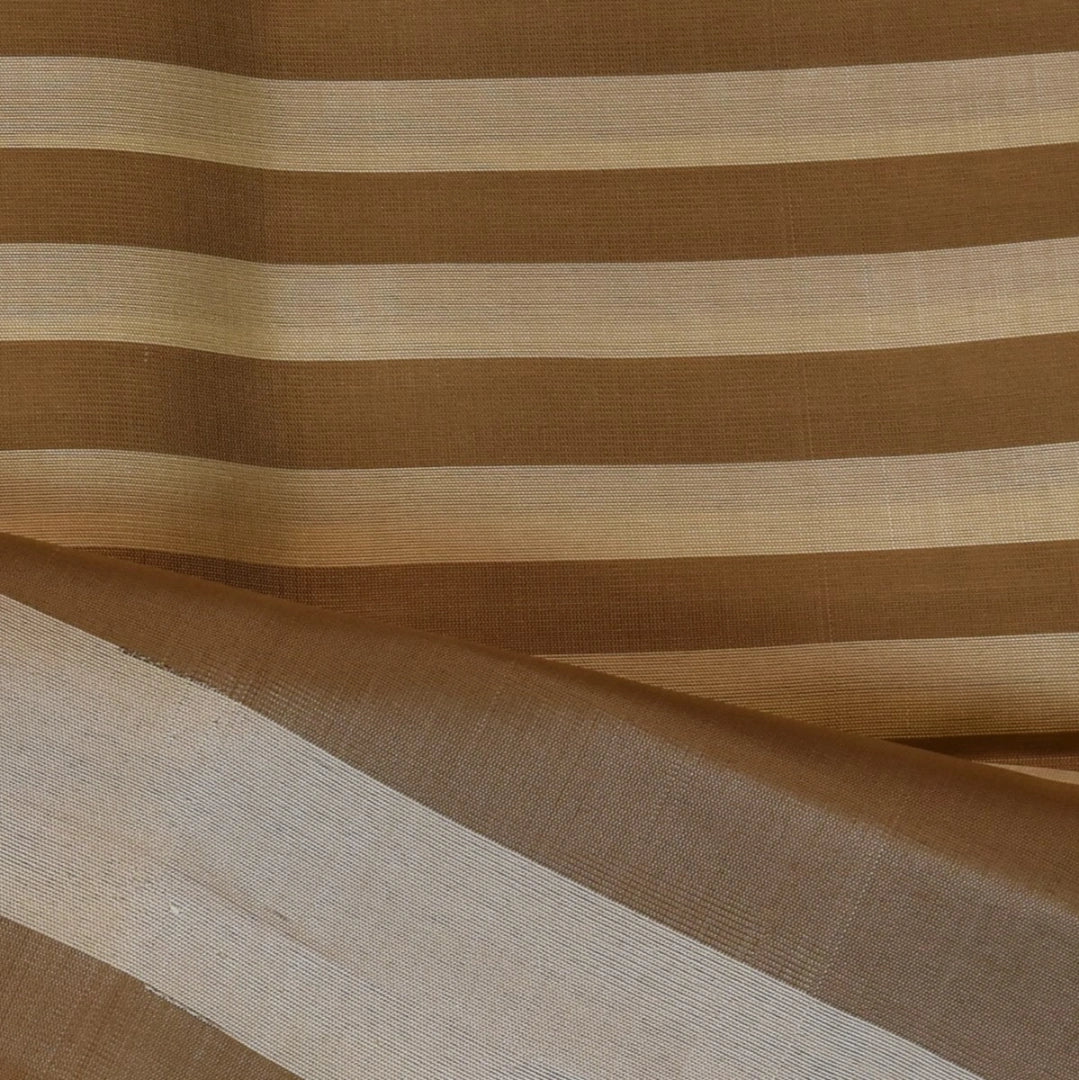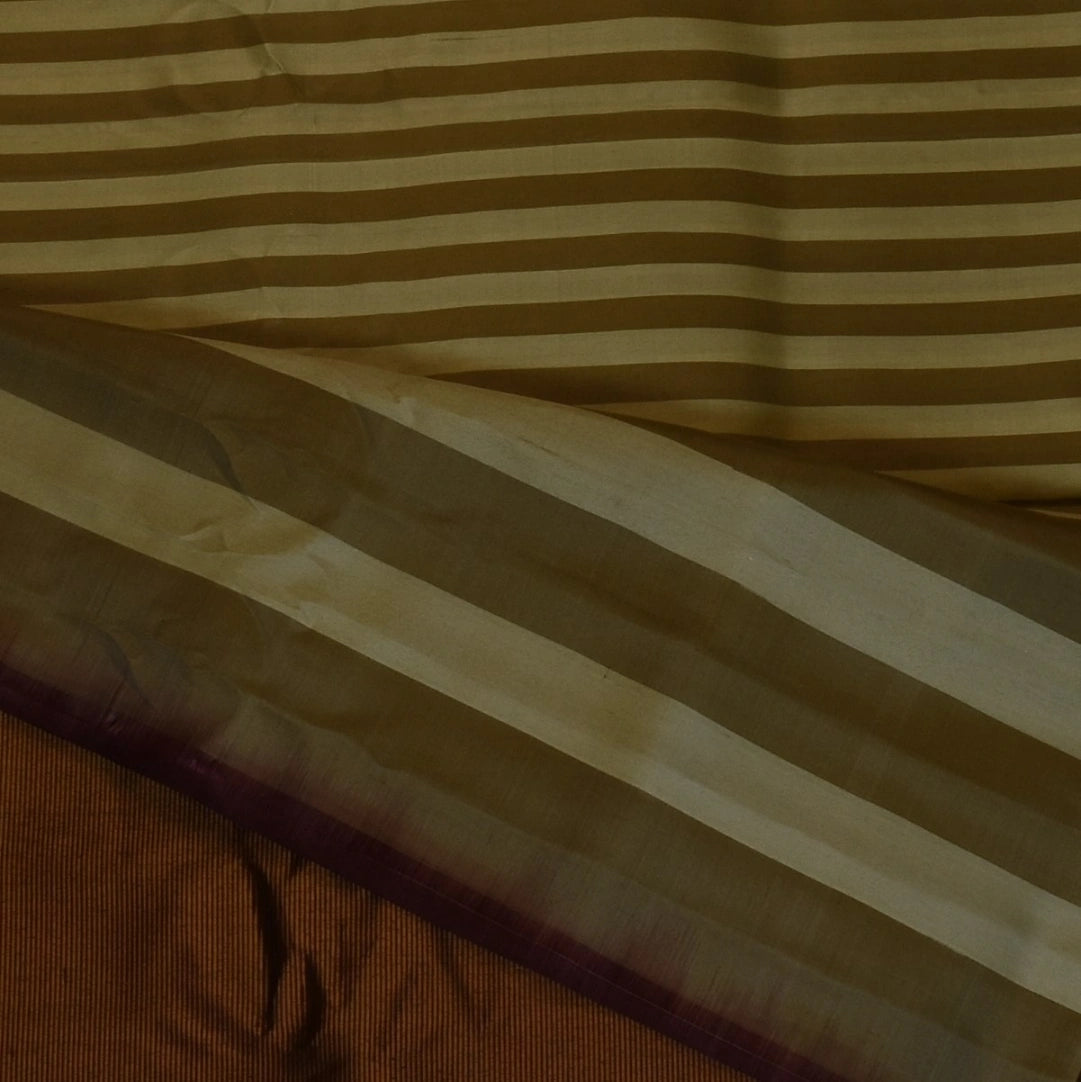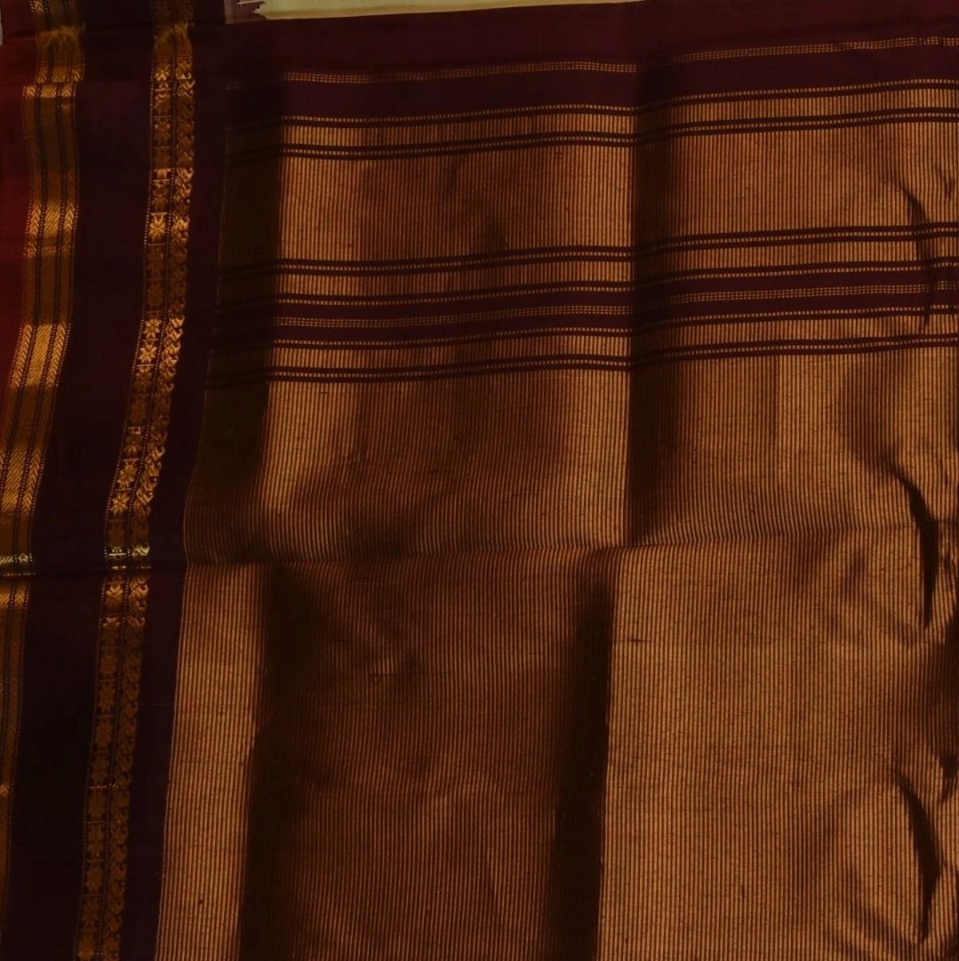 This pure gadwal silk saree in a khaki and cream shade features elegant traditional patterns, perfect for graceful appearances and festive flair.